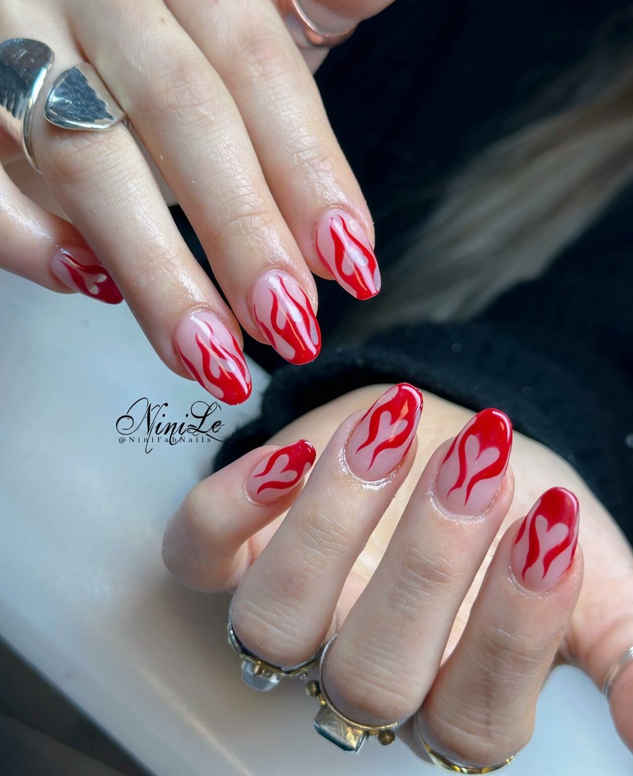 Red flames turning into tiny hearts? Obsessed. It’s such a clever blend of edgy and romantic. The soft nude base keeps it clean so the flame-hearts become the star of the entire look.