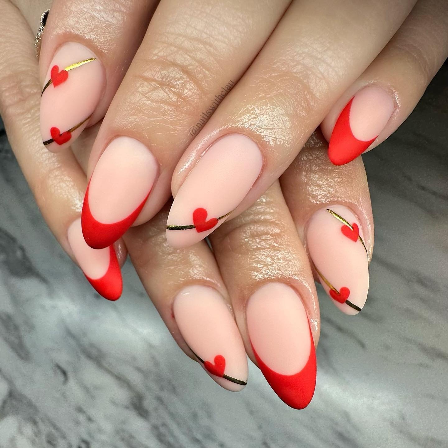 It’s a clever twist on Valentine nails because it feels both artsy and wearable. Definitely a “wait, how did you do that?” design in real life.
