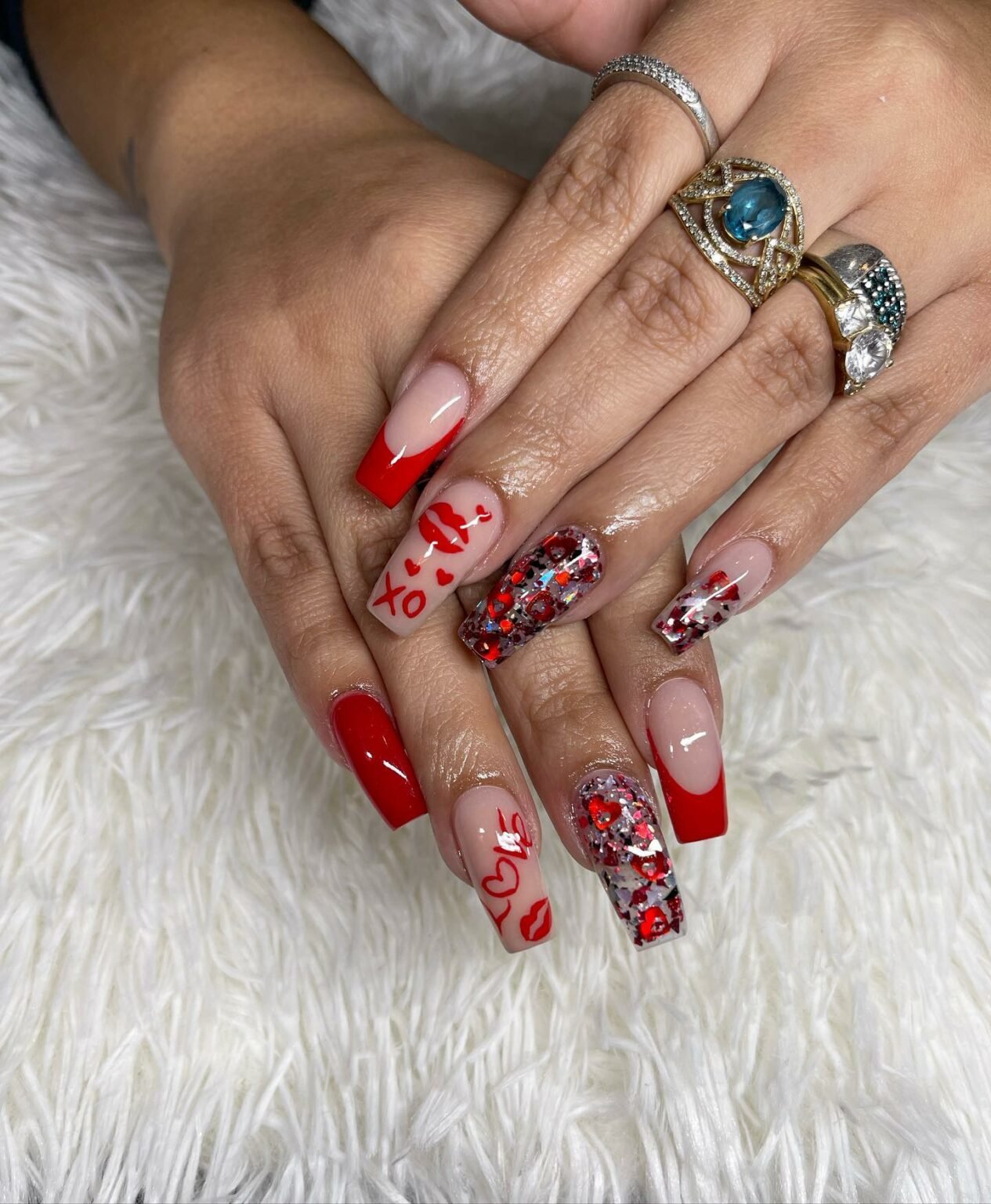 Red French, glitter, lips, XO, hearts — honestly this set is like a whole Valentine story told across ten nails. The clear glitter nails add so much sparkle, like confetti trapped inside glass. And that tiny red lip print? Adorable.