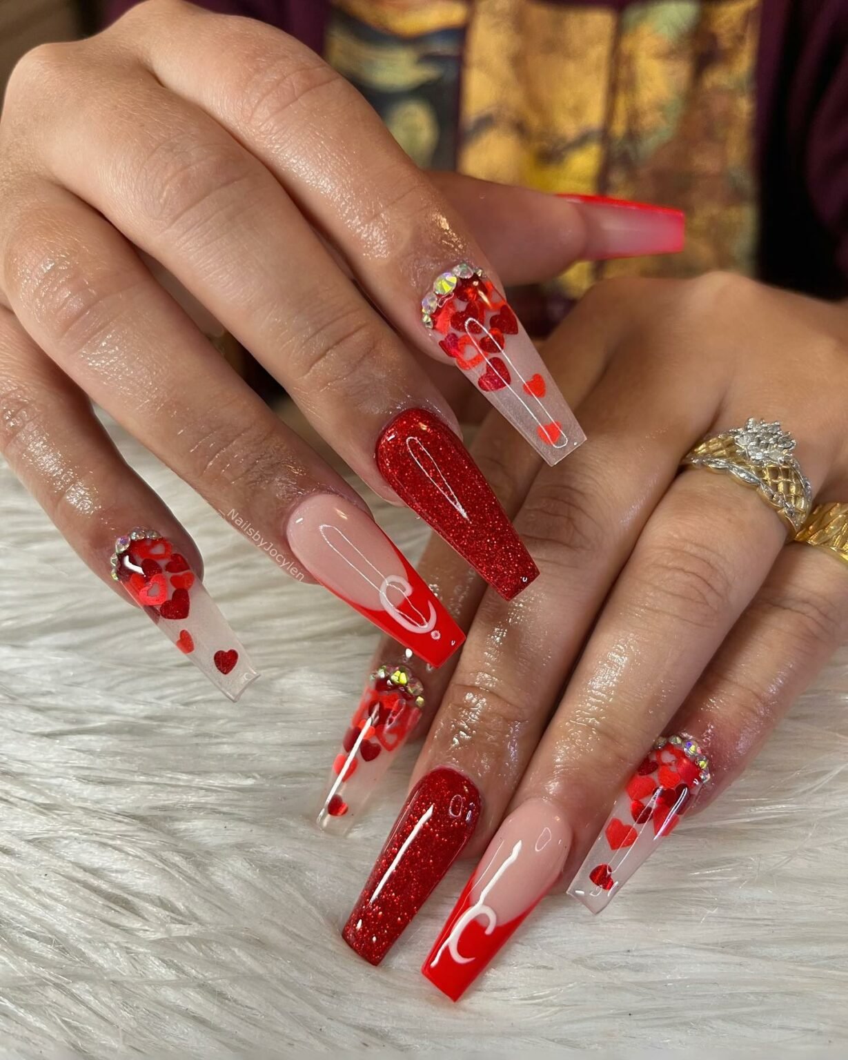 These nails feel like a Valentine’s celebration bottled into a manicure. Clear tips sprinkled with tiny red hearts give that playful, falling-confetti vibe, while the glittery red accents add just the right amount of glamour. The long shape lets every detail shine — from the glossy lines to the crystal clusters catching the light.