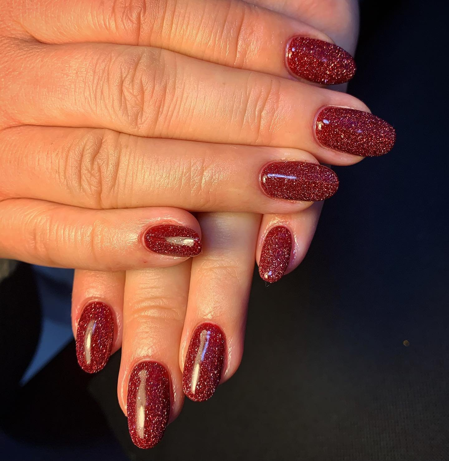 This one is for the sparkle lovers. The deep red glitter catches the light with every move, giving the whole set a warm, glowing kind of magic. The almond shape keeps it elegant, preventing the glitter from feeling too loud or flashy.