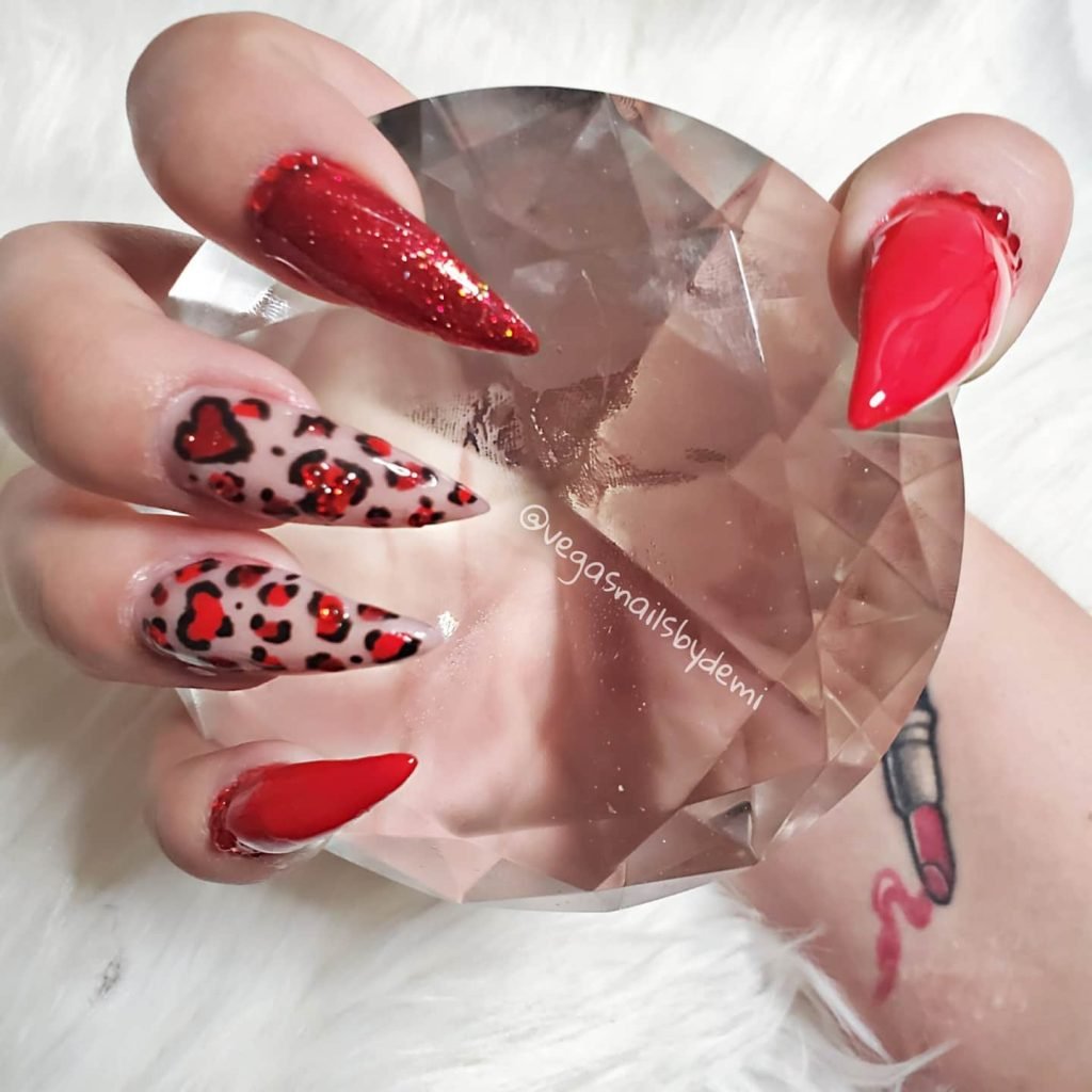 This one is for the girlies who want their Valentine nails with a little bite. The mix of bright red, sparkly glitter, and heart-shaped leopard spots is such a fun twist — flirty but with attitude. The shine on the glitter-red nail alone could stop traffic.