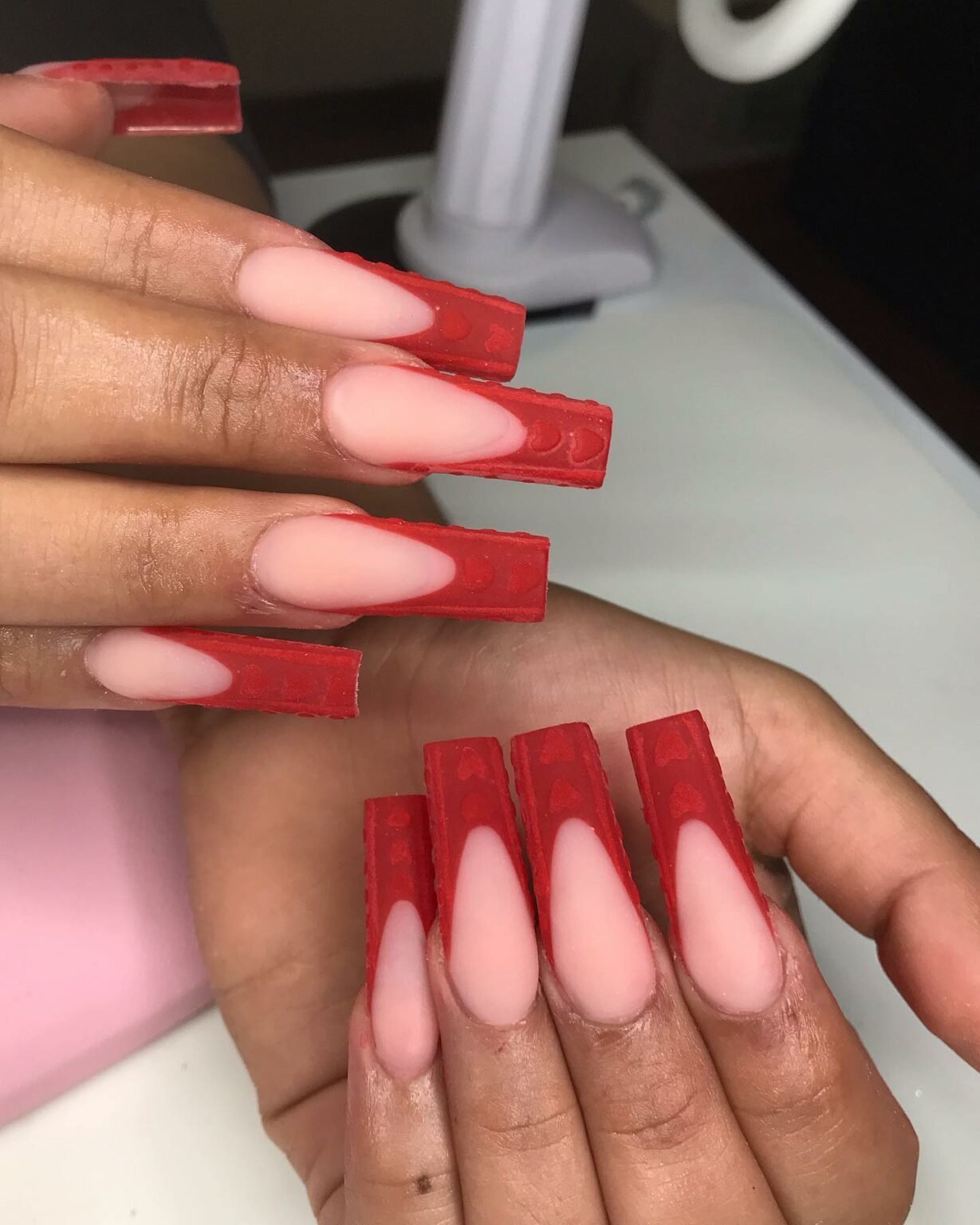 These matte, embossed red tips are such a statement. The raised heart textures look like candy pieces pressed onto the nails — playful, unexpected, and so fun. The contrast with the milky nude base makes them pop even more.