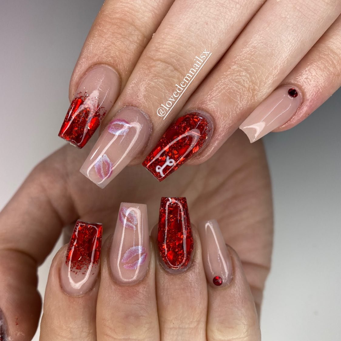 This set delivers luxury with a spark of flirtiness. Red shattered foil pieces create bold, reflective tips, while soft nude nails decorated with delicate lip prints bring all the romantic energy. The tiny accents of white lines add movement and keep the whole look visually interesting.