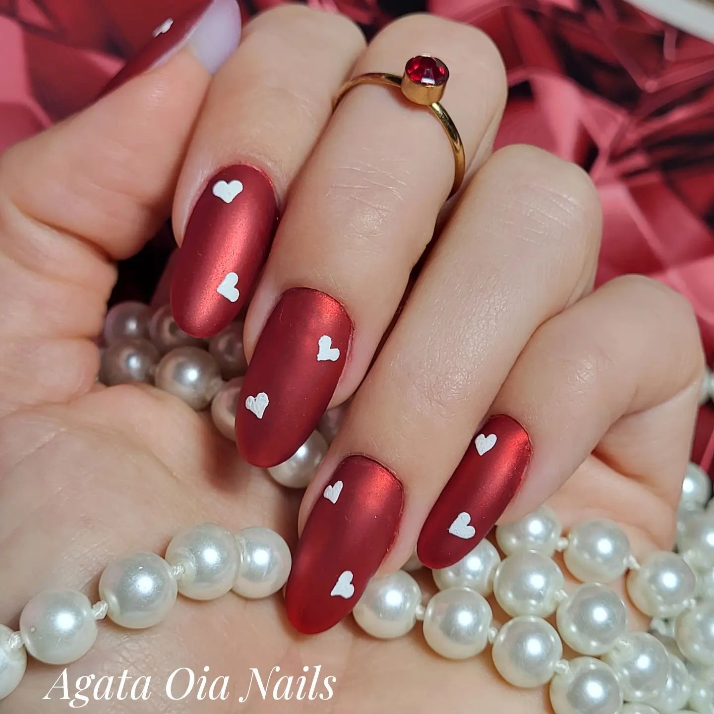 These matte red nails look as smooth as silk — almost like velvet under soft lighting. The tiny white hearts scattered across each nail bring a touch of innocence and charm, creating a sweet contrast against the rich ruby base.