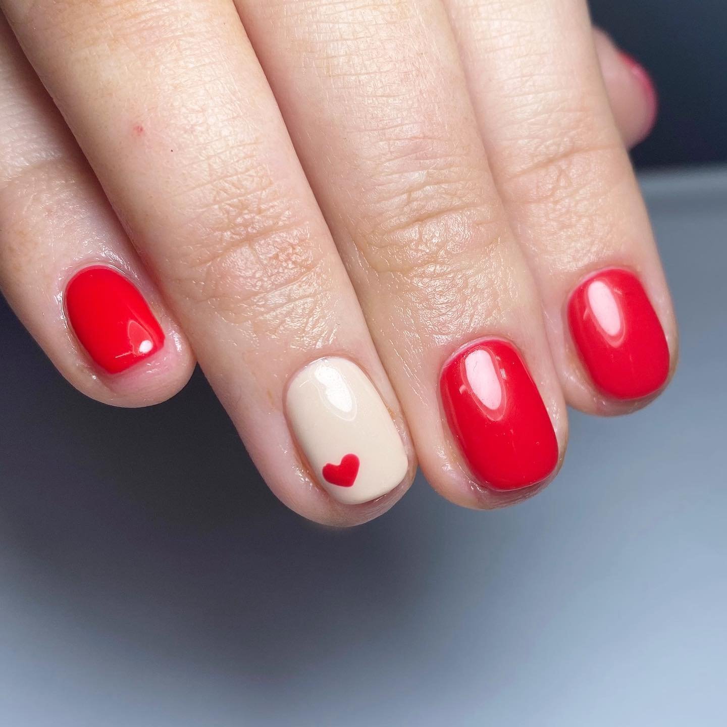 There’s something so refreshing about a manicure that doesn’t try too hard—and this one nails that soft, Valentine sweetness. The glossy red feels classic and confident, while the single cream accent nail with that tiny heart? It’s the kind of detail that makes you smile without even realizing it.
