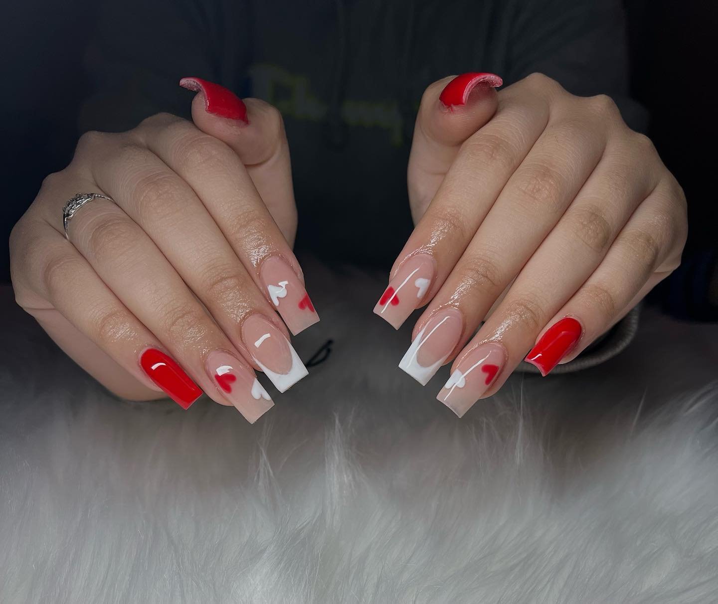 Soft nude meets bright red in the cleanest way here — and then you notice the cascading hearts. It’s like the tips are literally melting into Valentine’s Day energy. The mix of solids, heart clusters, and tiny rhinestone accents makes it feel polished but still romantic.