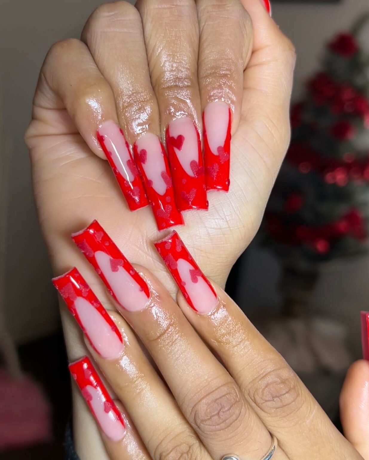 This set goes bold — long square nails dipped in bright, glossy red with heart-shaped drips melting down from the tips. It’s like the polish is literally pouring love onto the nails. Super fun, super dramatic.