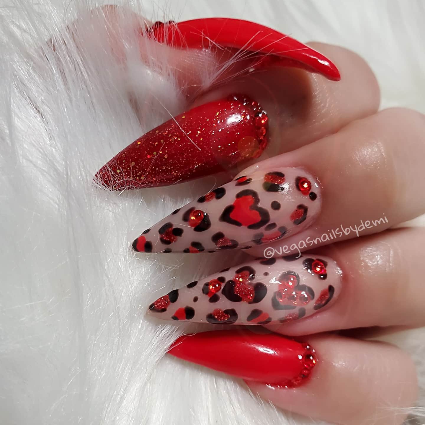 The close-up version makes it even better — look at that dimension. The little red crystals tucked into the leopard hearts? It’s giving maximum drama in the best way. And the transition from soft nude base to fierce red art keeps everything cohesive.