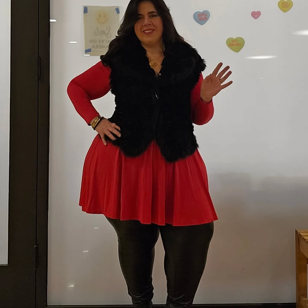 A red flowy dress paired with a sleek black vest? It’s fun, comfy, and full of personality. The textures do a lot of the talking here — the faux-fur vibes mixed with the bright red gives a playful yet put-together feel.