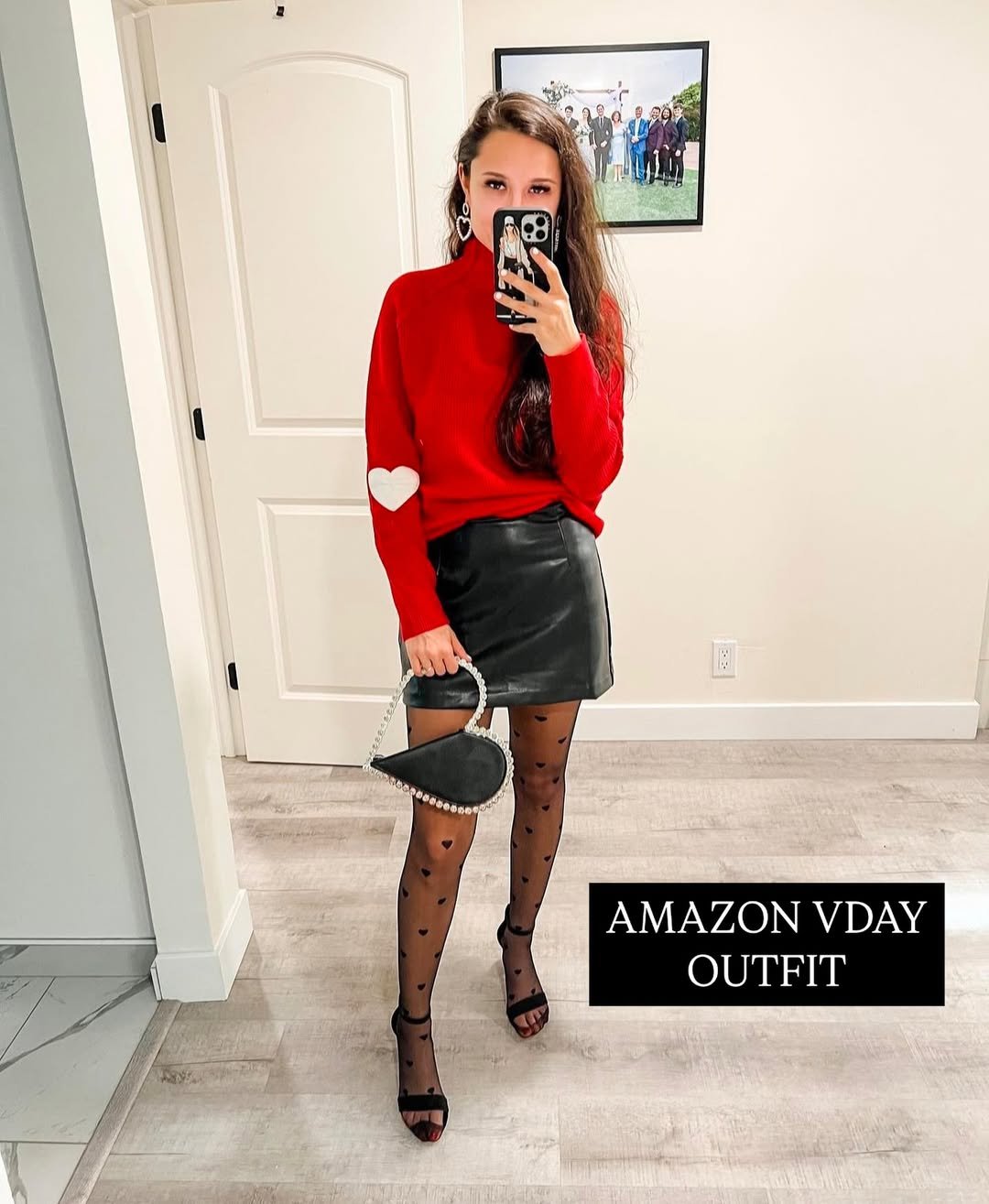 The pearl-trim heart bag is such a fun finishing touch, tying the whole look together with a wink to the holiday. Cute, modern, and totally photo-ready.