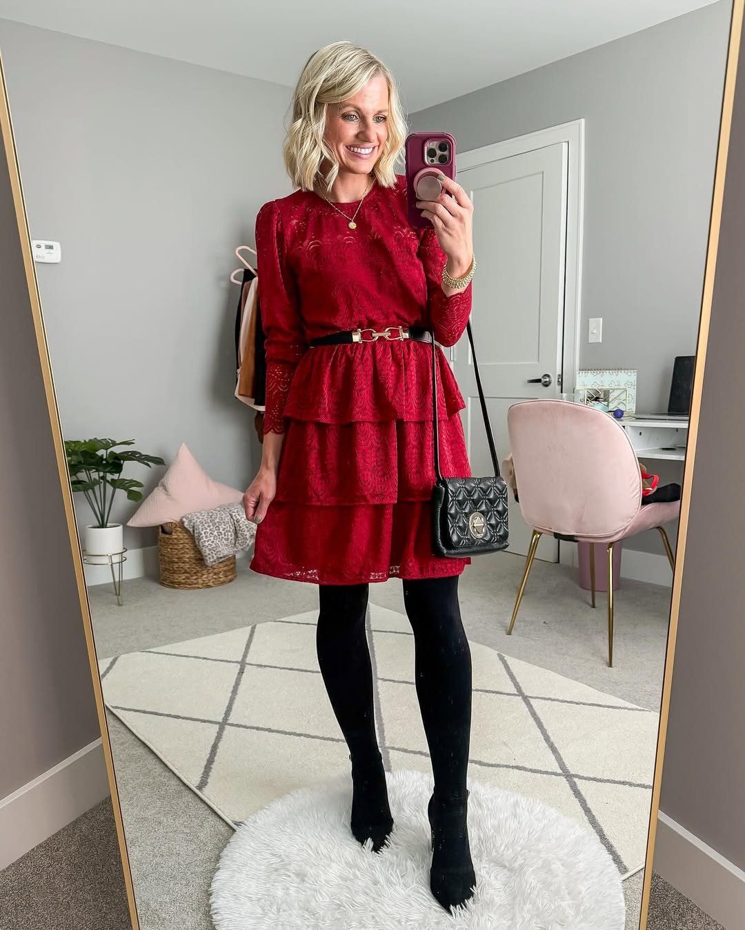 And the black tights + black bag combo? A simple but smart way to keep the focus on that stunning red. It’s romantic without being over the top—perfect for date night or a special event.