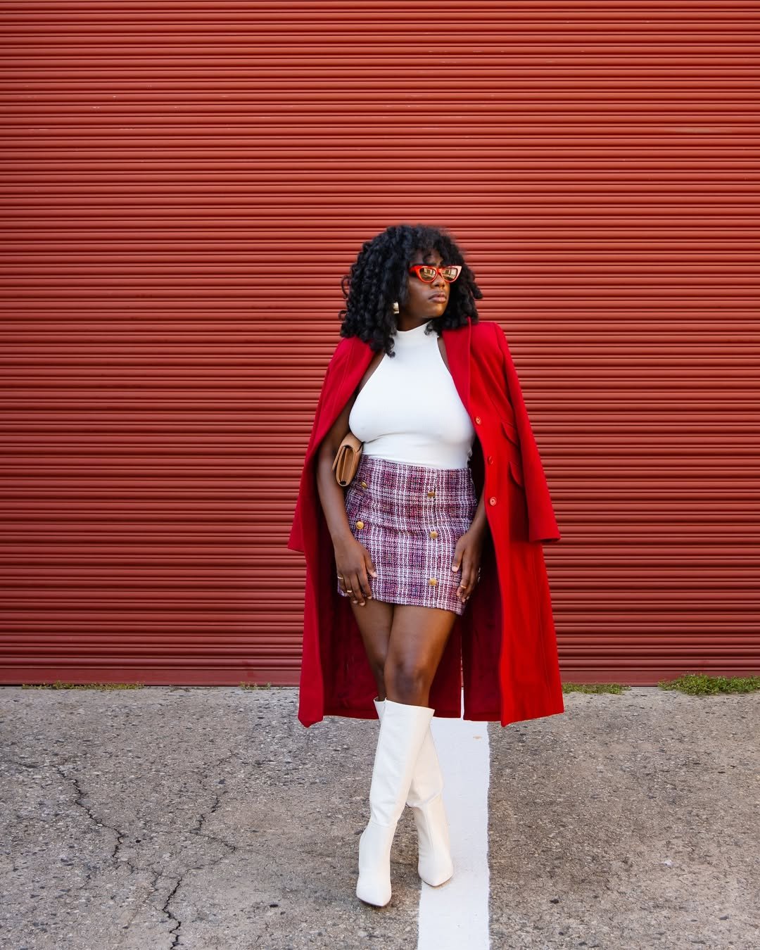 This one is bold in the best way. The red coat draped over the shoulders paired with the plaid mini and white boots? Icon behavior. Add in the red cat-eye sunglasses and you’ve got old-school glam with modern attitude.