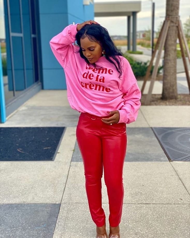 Pink and red pop all over again, but in a totally different mood. The crème de la crème sweatshirt feels cute and casual, especially against those glossy red pants that add just the right amount of shine. It’s the perfect mix of “off-duty” and “I still care.”