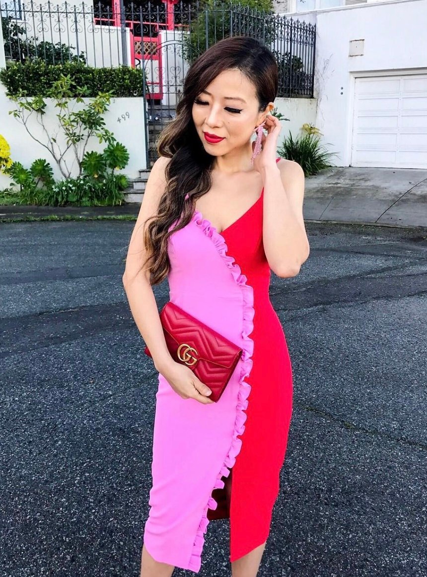 Red and pink merge in the most charming, feminine way. This fitted midi with its ruffled diagonal paneling feels playful yet elegant, creating a silhouette that flatters from every angle. It’s an instant Valentine’s dress — the kind you put on and immediately feel pretty.