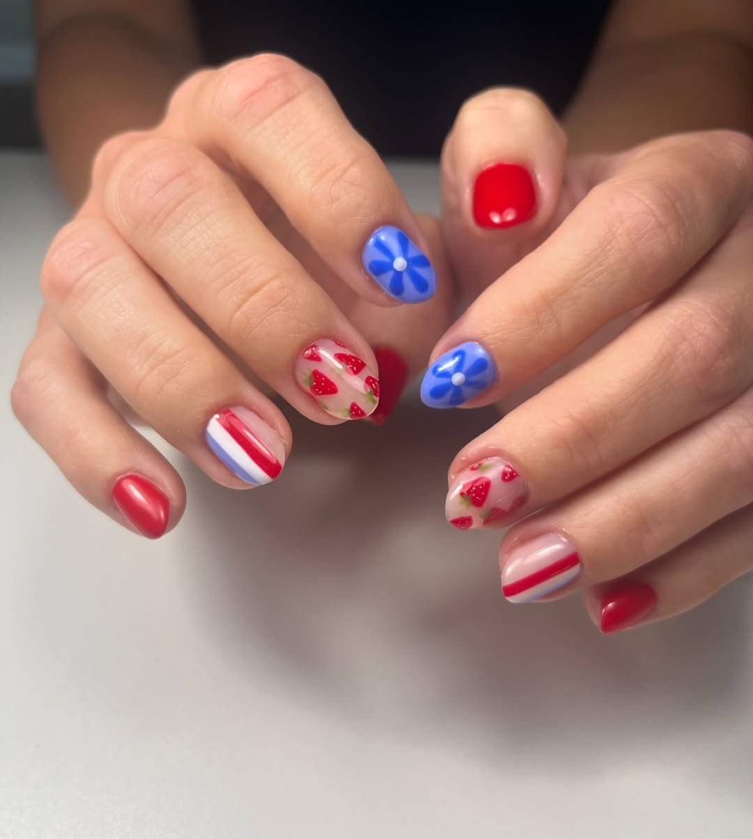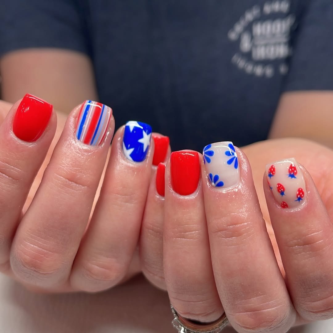 This manicure keeps things short, sweet, and packed with personality. Red solids, blue stars, tiny florals, and striped accents all come together in a playful patriotic mix.