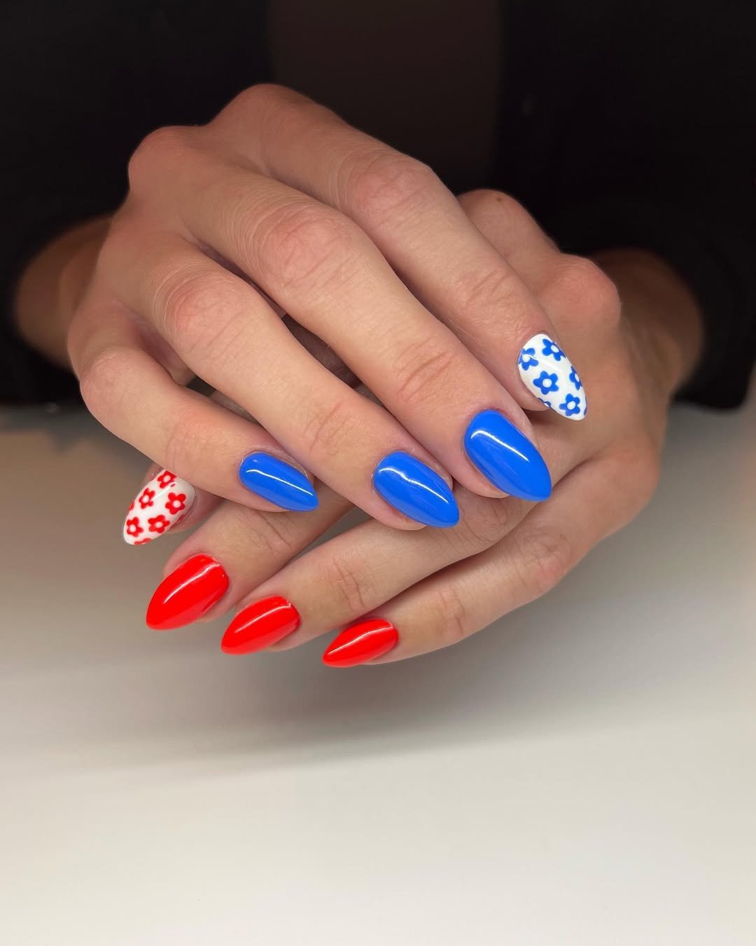 Bright blue and vivid red nails are paired with delicate floral accents to create a look that’s both bold and sweet. The contrast between the solid colors and the tiny flower details really makes the design pop.