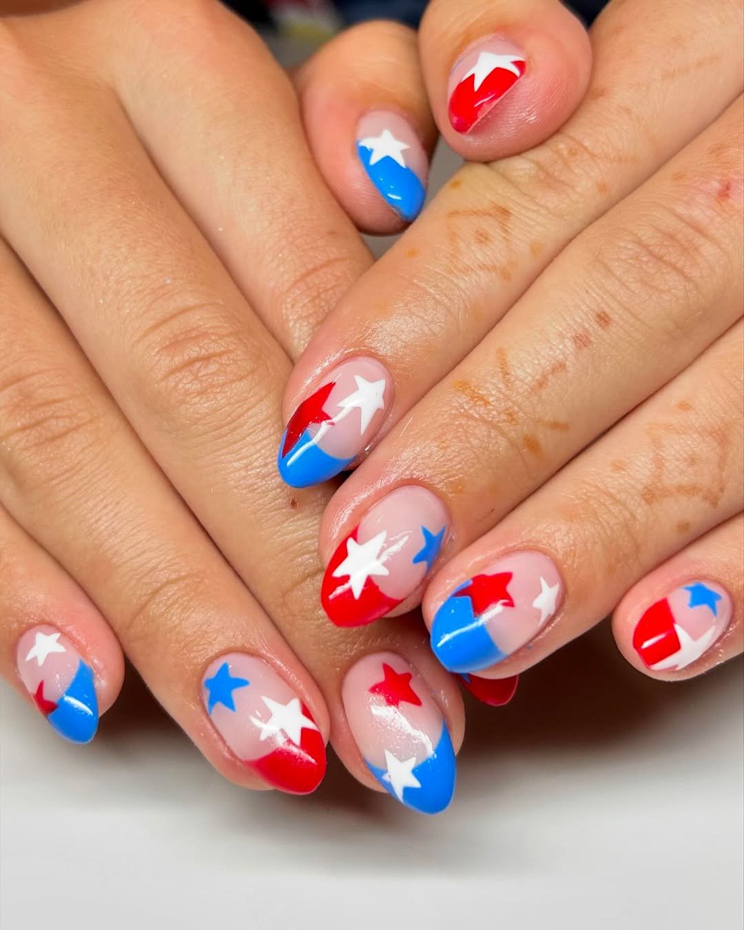If you want something simple but eye-catching, this star-themed set does the trick. Red and blue tips meet crisp white star shapes that instantly give the manicure a festive feel.