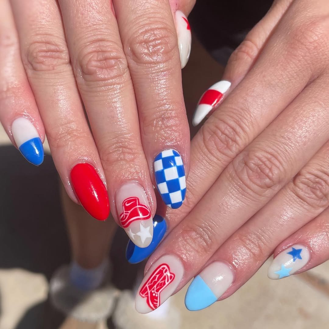 These nails feel like summer road trip energy. Bright red, soft blue, and bold checkerboard patterns mix together with tiny star accents and even a playful cowboy boot design.