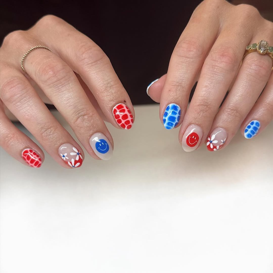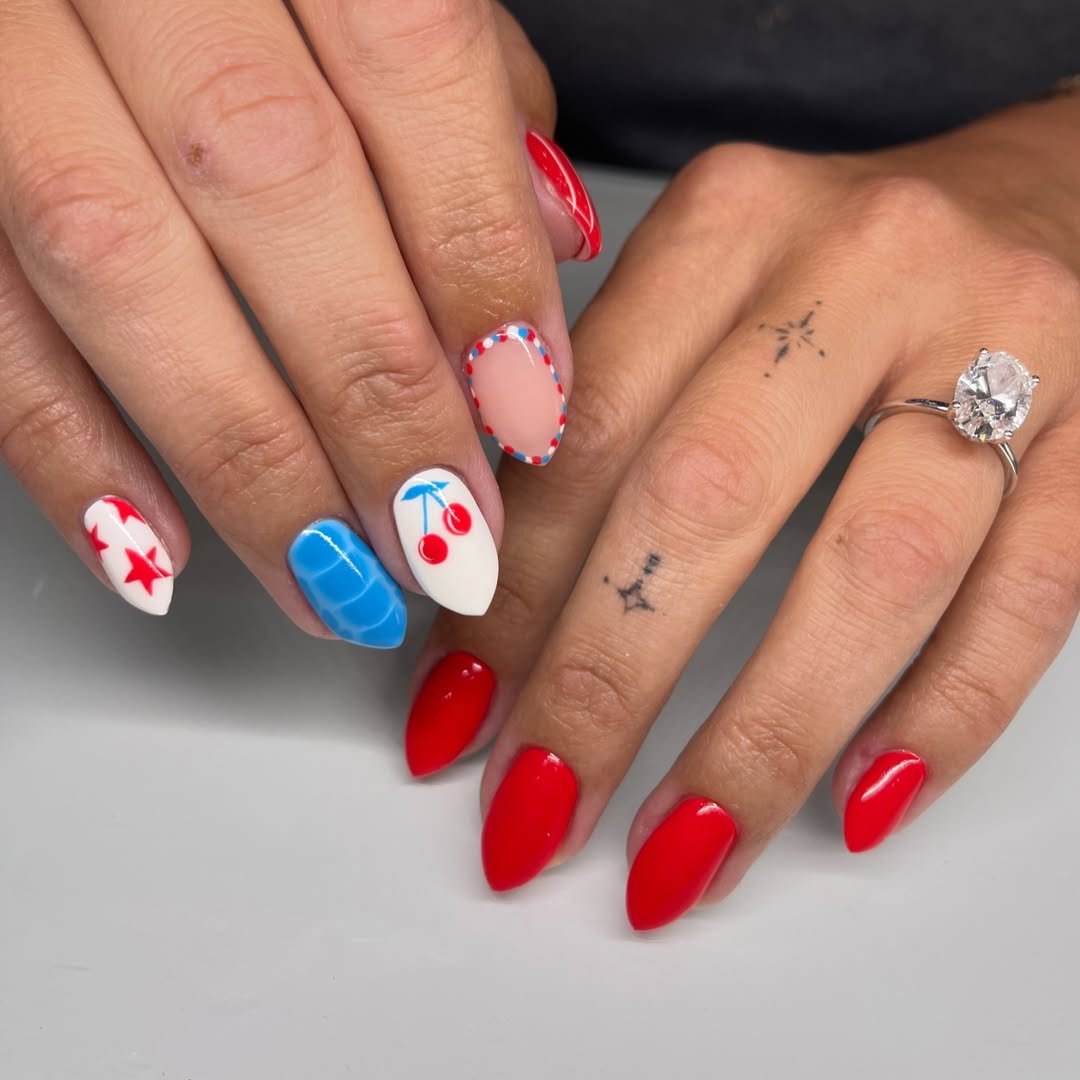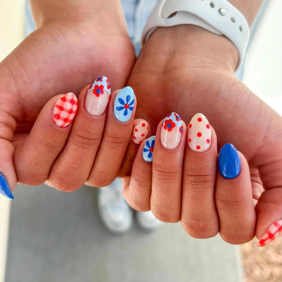What makes this manicure fun is the variety. Each nail brings something different to the table, but the red, white, and blue palette keeps everything cohesive—like a little picnic party happening on your fingertips.