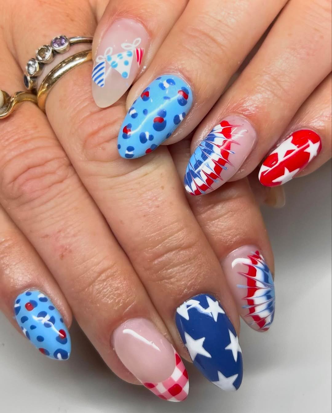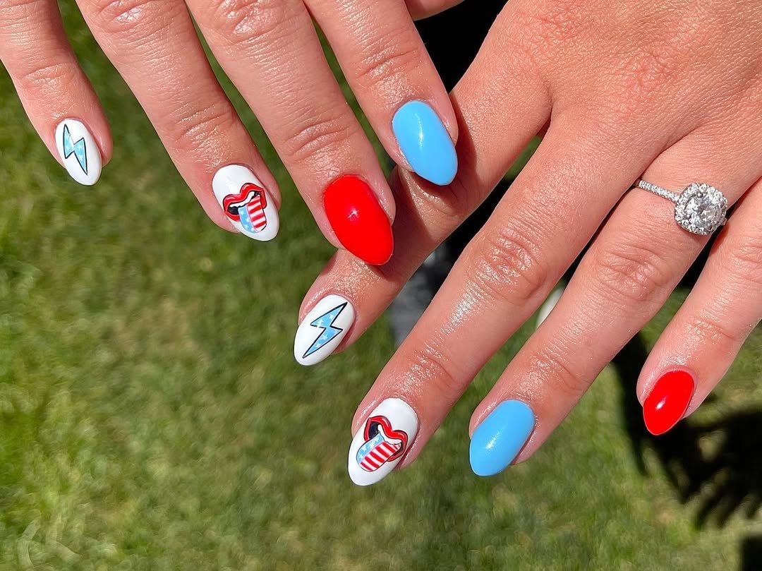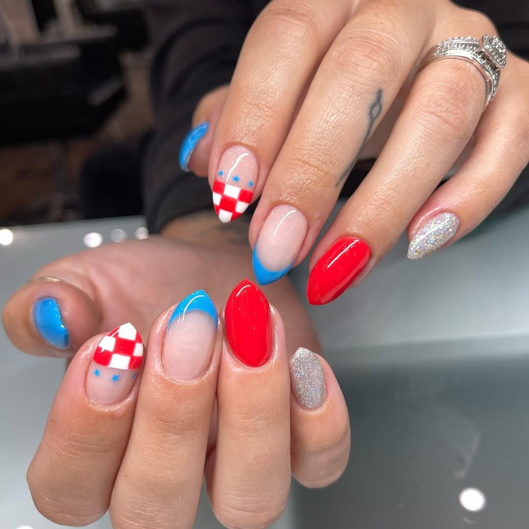What makes this manicure fun is the variety. Each nail brings something different to the table, but the red, white, and blue palette keeps everything cohesive—like a little picnic party happening on your fingertips.