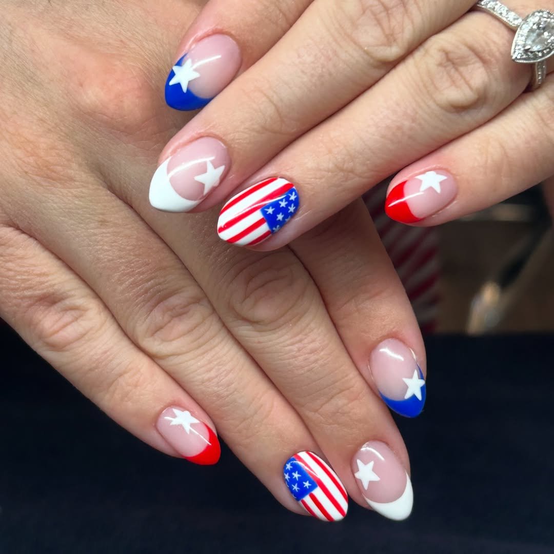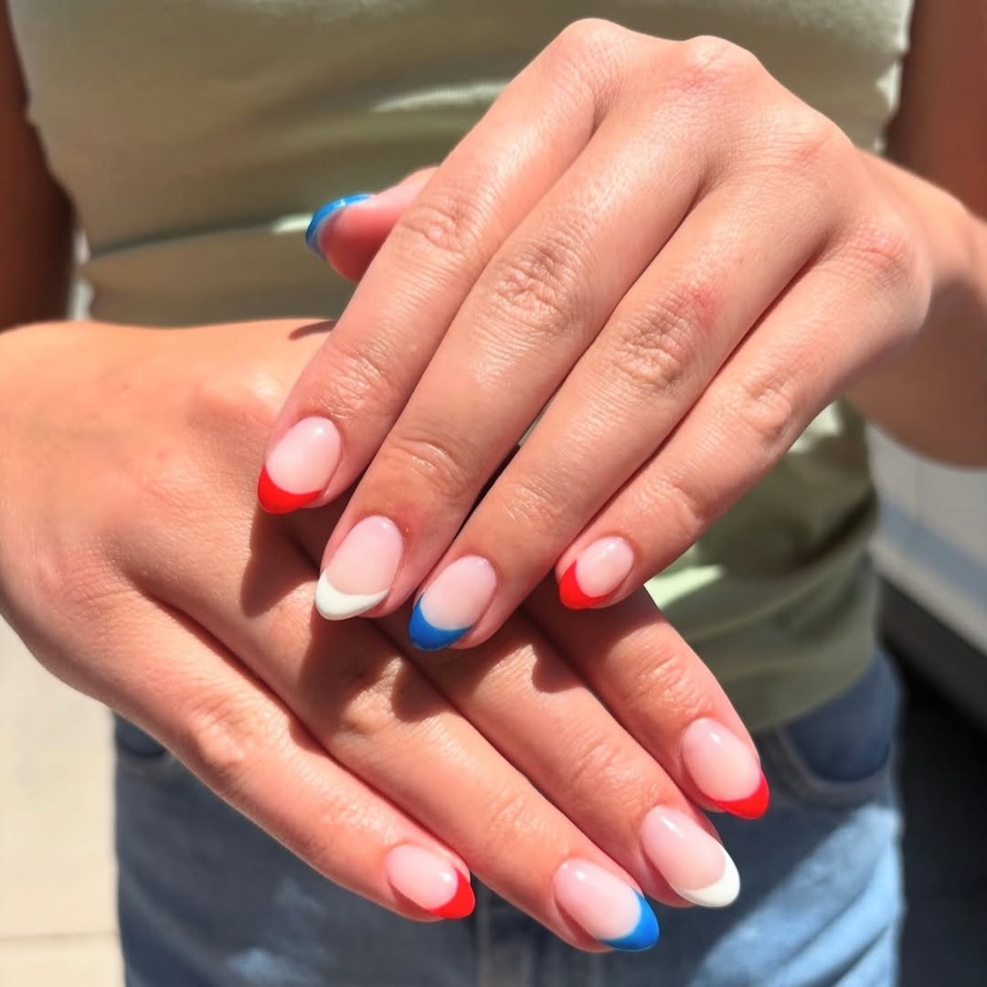 If you love a clean look with a twist, this manicure nails it. Soft nude bases are paired with crisp French tips in red, white, and blue, creating a modern spin on a timeless style.