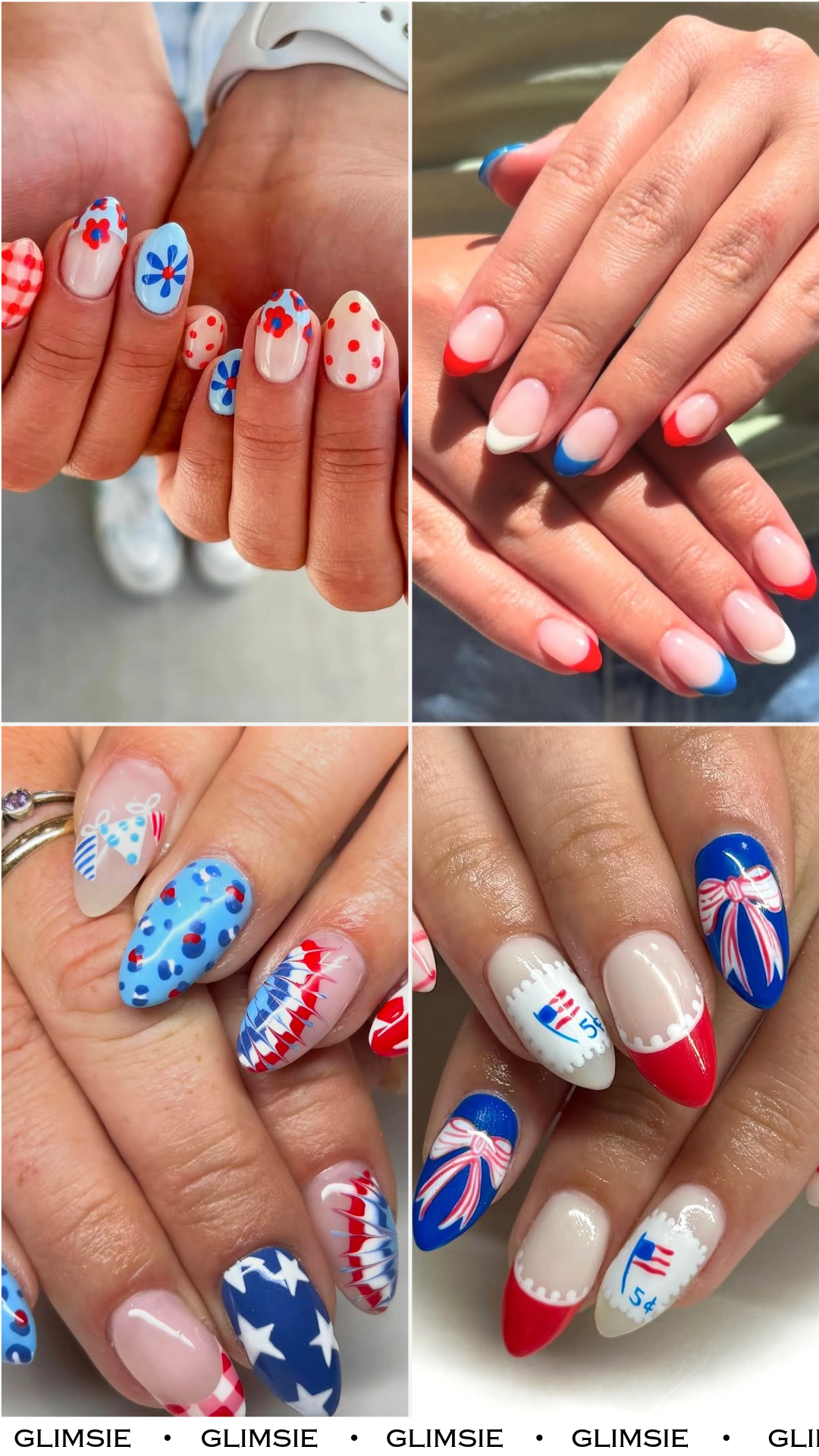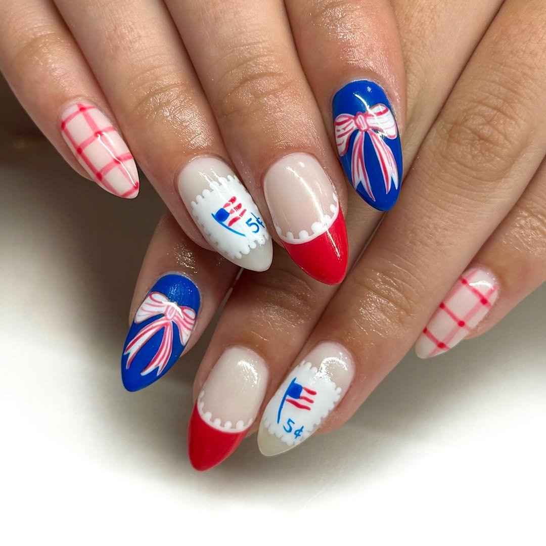 This set leans all the way into the patriotic theme. Plaid patterns, bows, and even a cute little “5¢ stamp” design make these nails feel like a playful nod to vintage Americana.