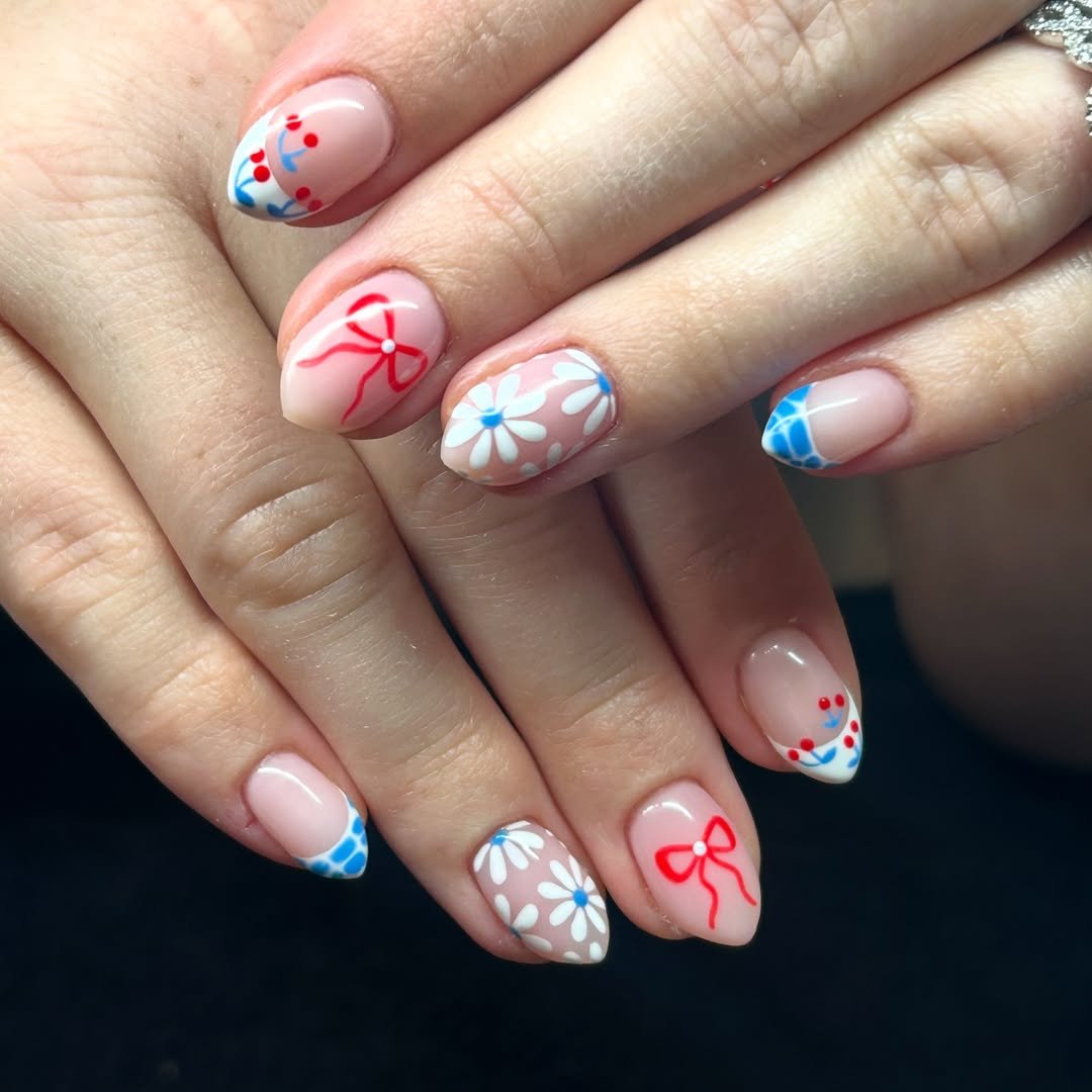 These nails lean softer and more delicate while still keeping the patriotic palette. Tiny bows, daisies, and subtle blue patterns sit on a sheer pink base, giving the whole set a light and airy feel.