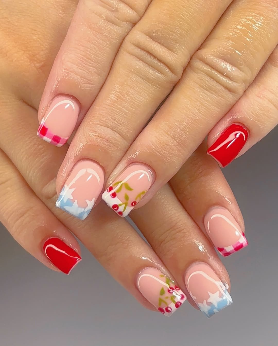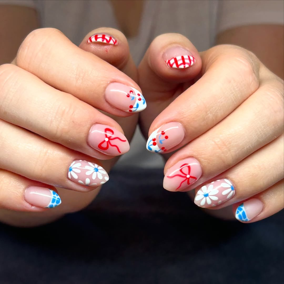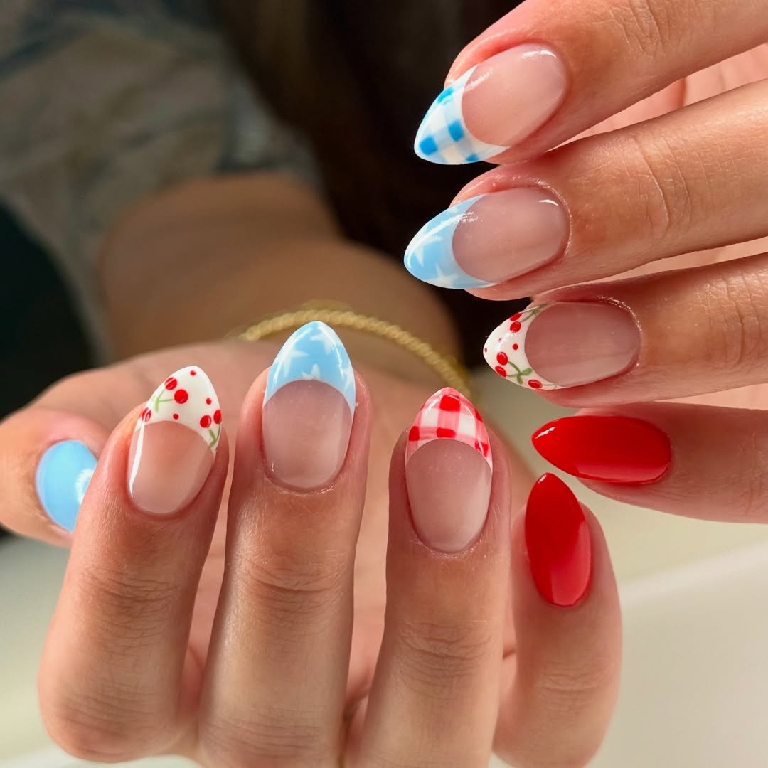 This set keeps things delicate and airy. Soft nude bases are paired with red gingham tips, blue star accents, and tiny cherry details that give the whole manicure a light, summery vibe.