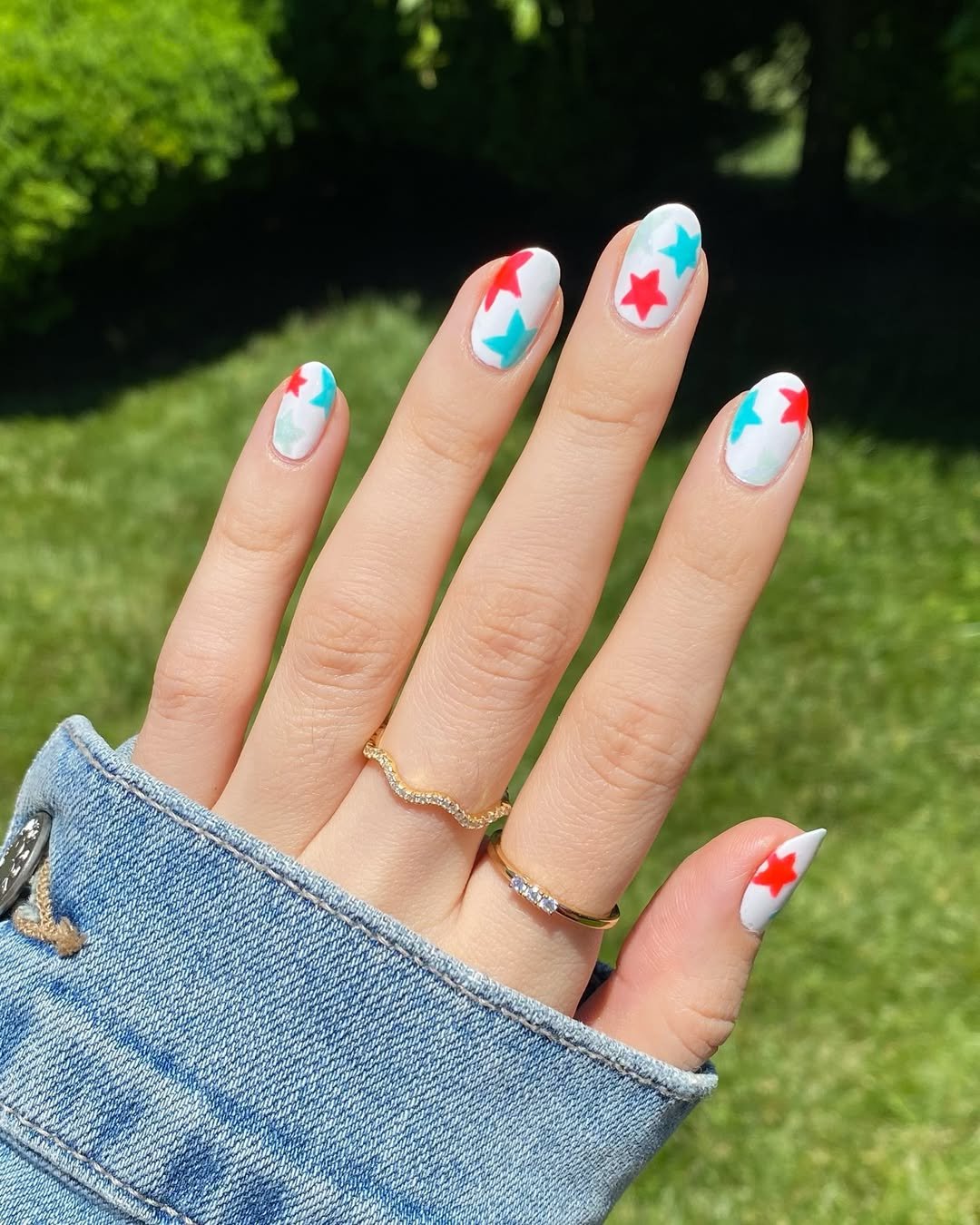 These nails feel like a little celebration on your fingertips. A clean white base sets the stage while bright red and teal stars scatter across each nail, creating a playful, almost confetti-like effect.