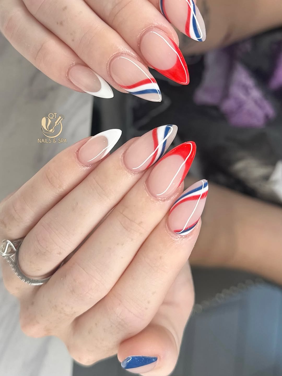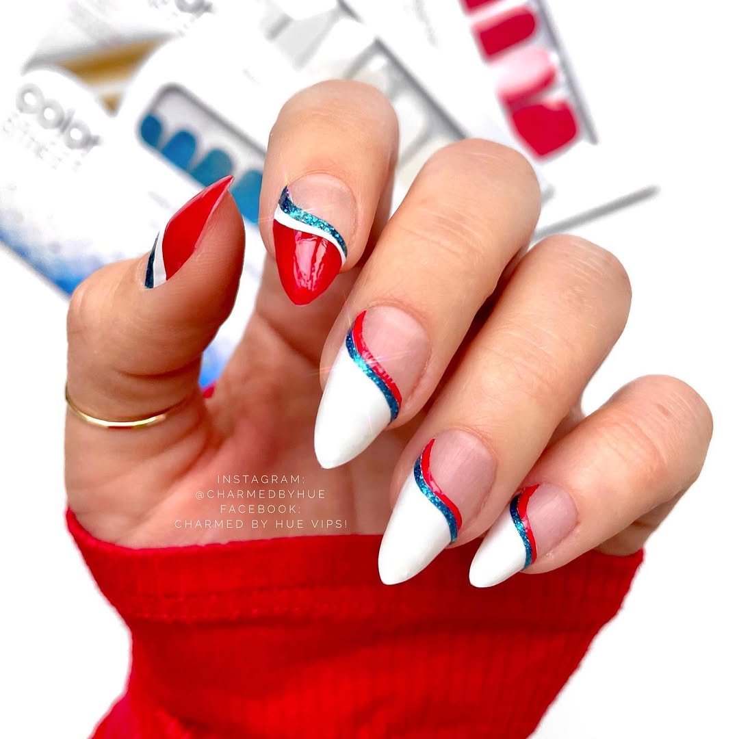 These nails take a sleek, modern route with the red, white, and blue palette. Soft nude bases are paired with flowing wave-like stripes that curve across the tips like little ribbons.