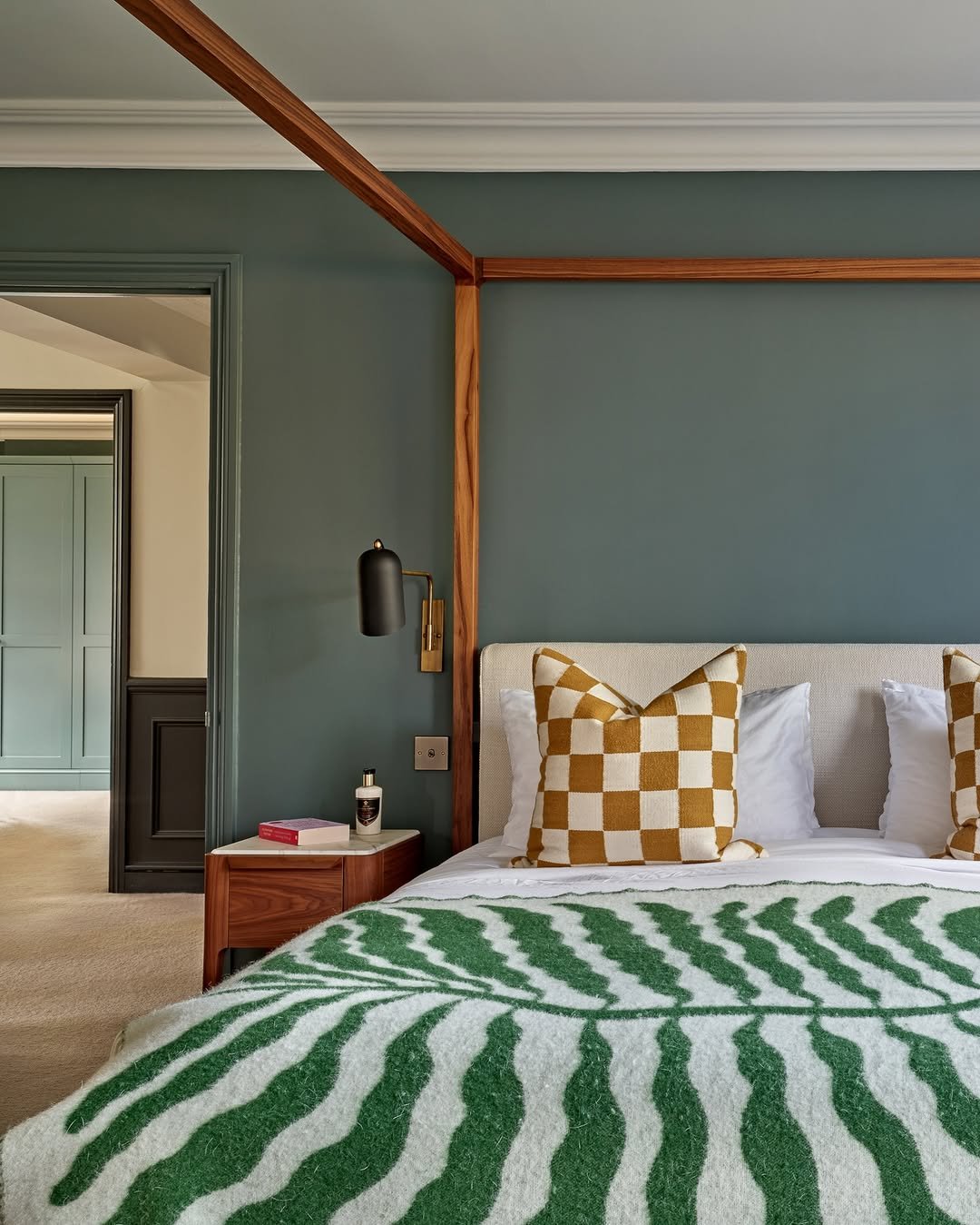 This one leans into a quieter kind of luxury. Deep olive bedding, soft light, and pared-back styling create a space that feels almost meditative.