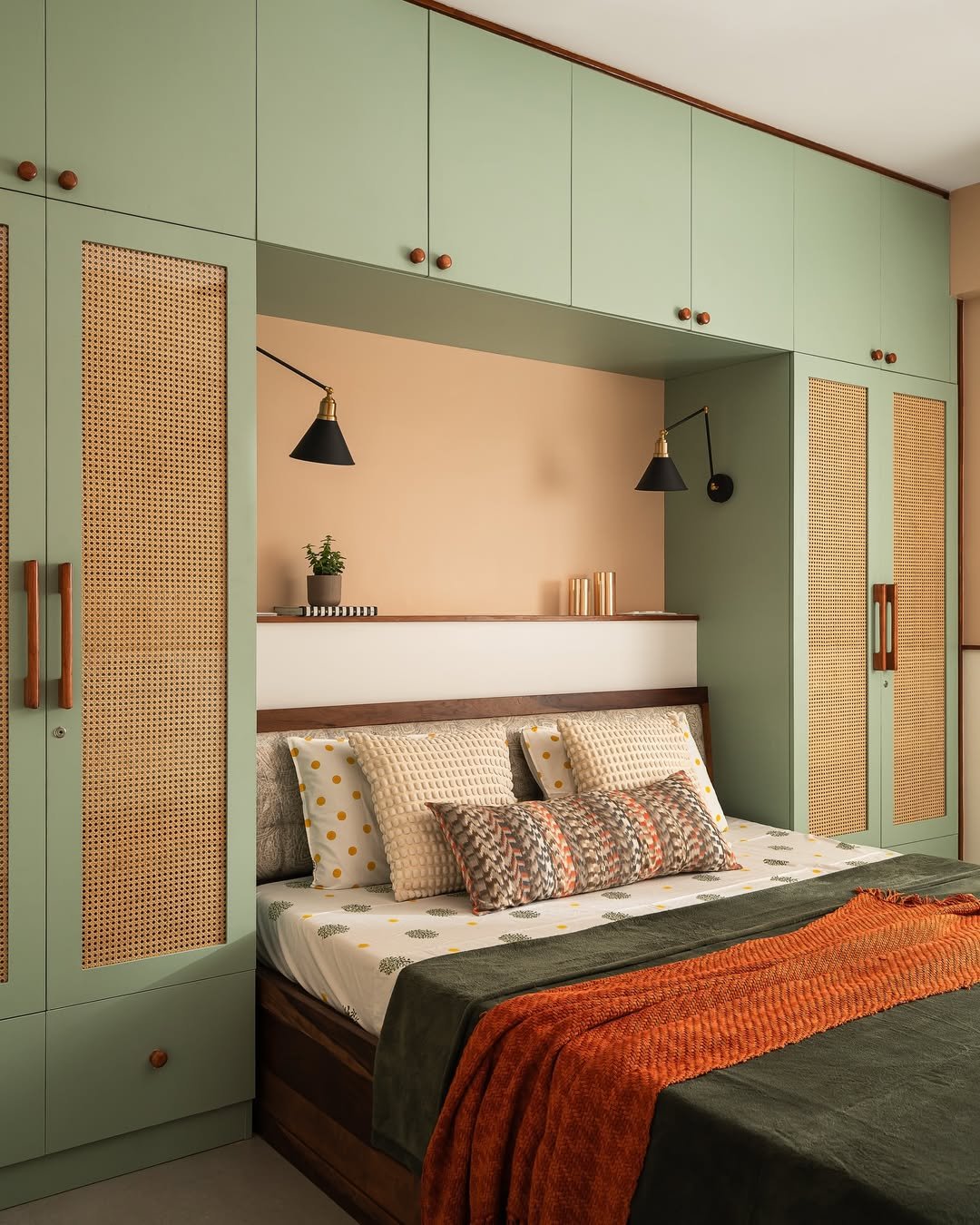 Here, sage becomes part of the architecture. The built-in cabinetry wraps the bed in a soft green frame, while cane panels add texture that keeps everything from feeling flat.