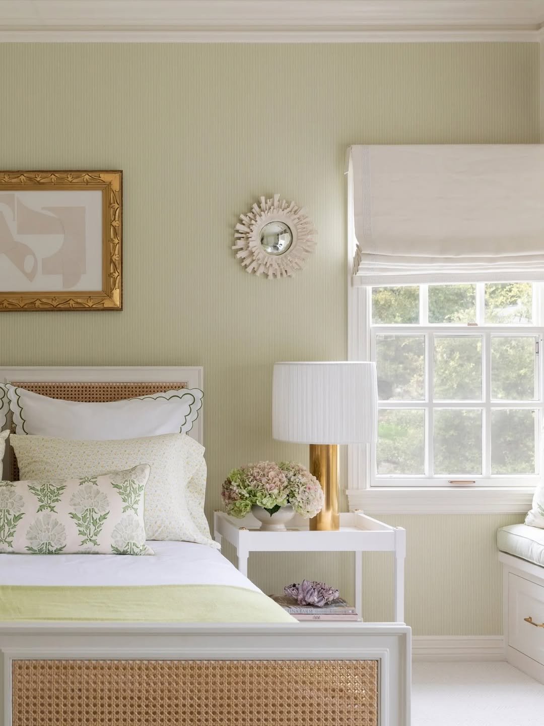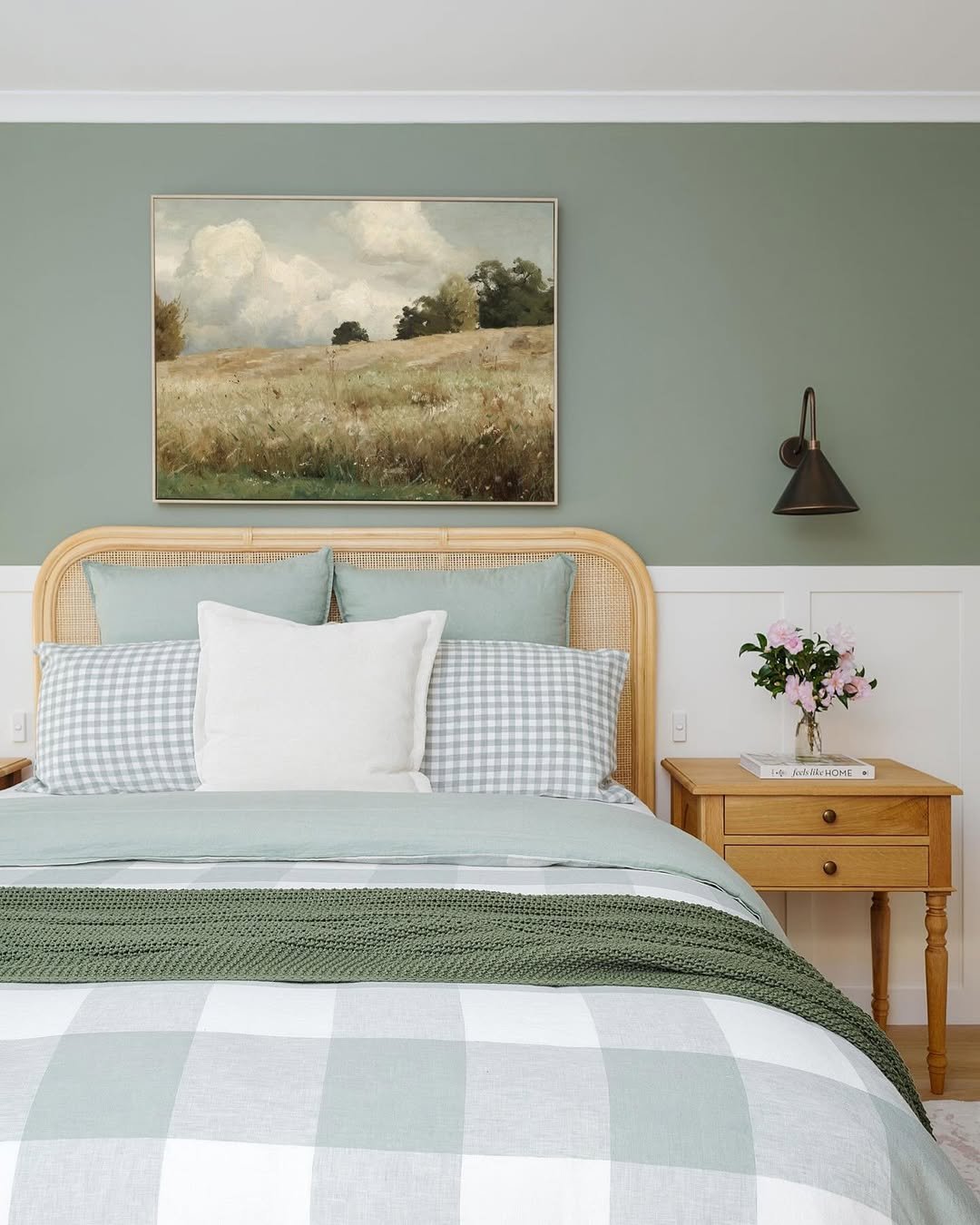 This one leans into that timeless cottage charm. The sage wall paired with crisp white paneling and a woven cane headboard creates a look that feels both fresh and nostalgic.