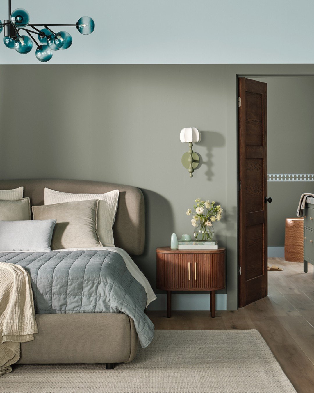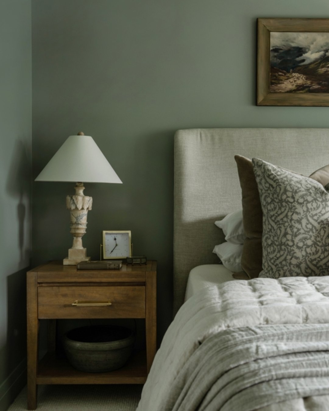 This version of sage goes a little deeper, a little moodier. It wraps the room in a cocoon-like feel, especially when paired with darker wood and layered neutrals.