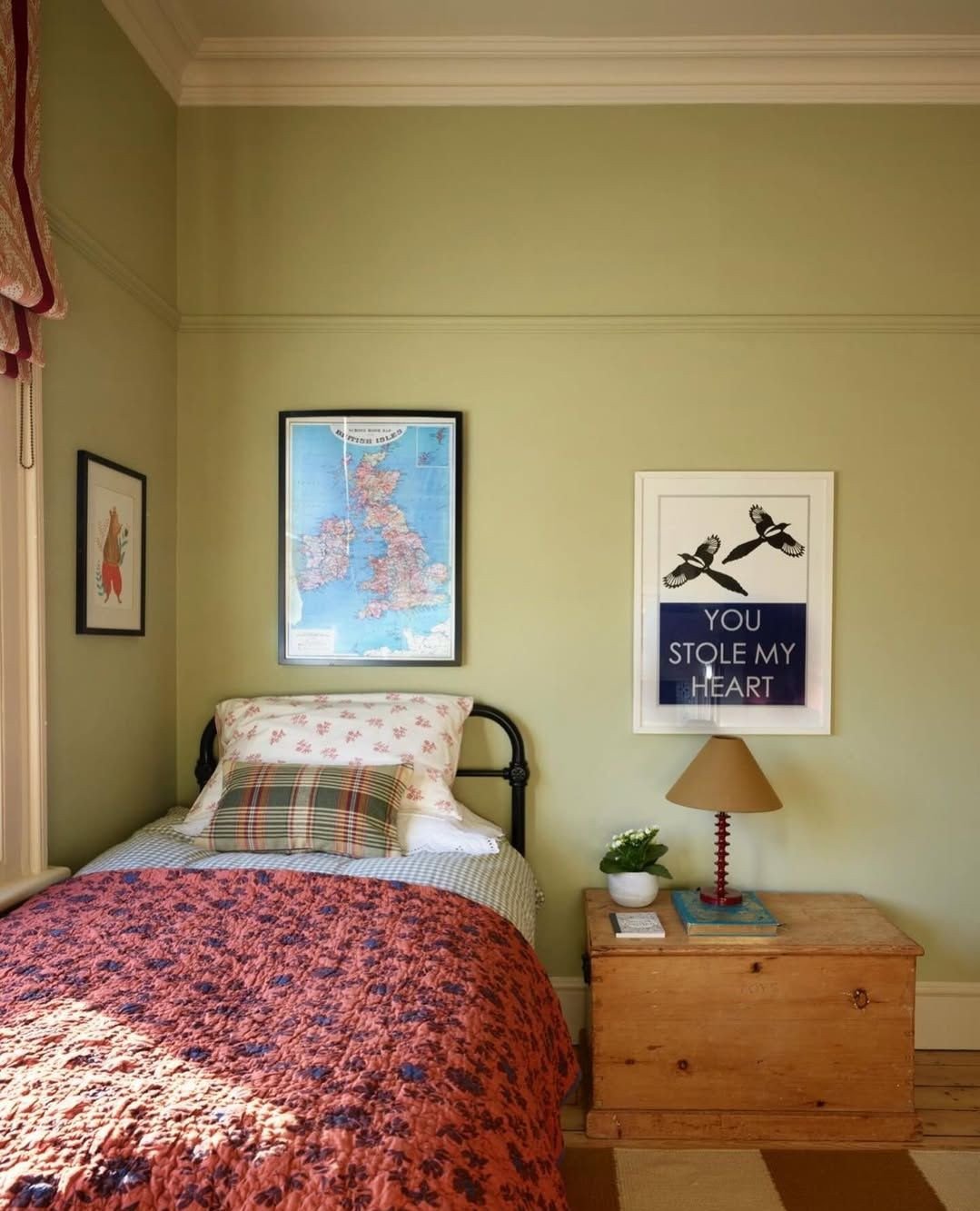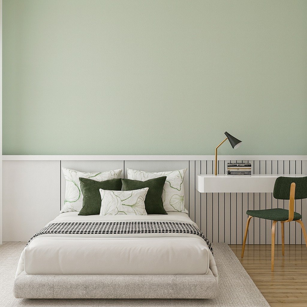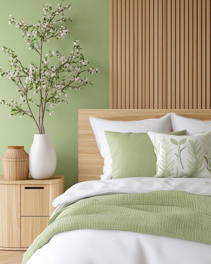 This one feels like a breath of fresh air. Pale sage walls paired with light wood furniture create a soft, natural palette that feels grounded and calm.