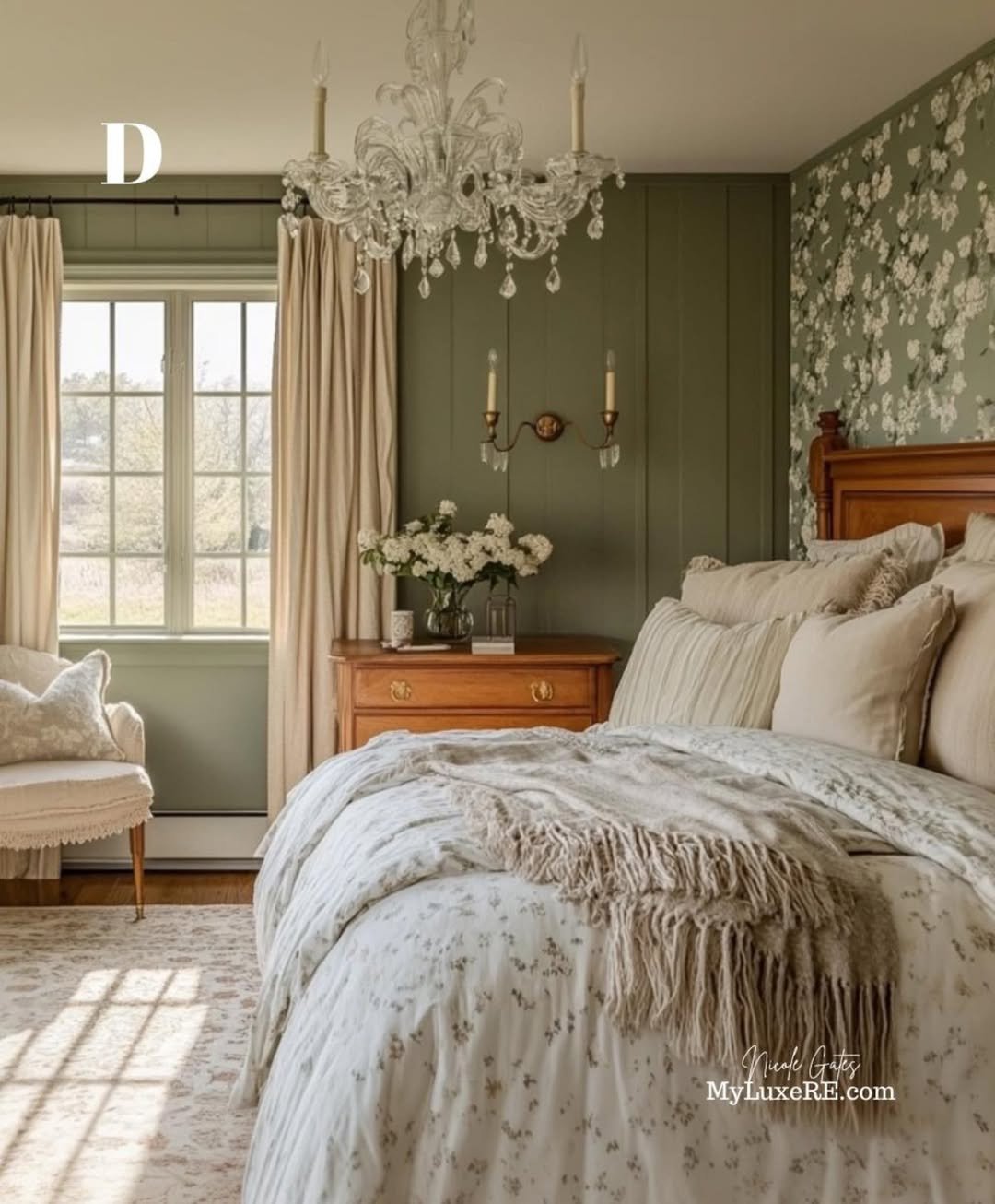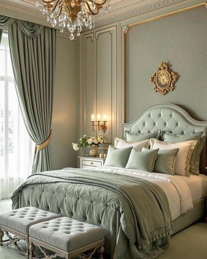 This one leans all the way into romance. The sage walls paired with ornate molding, gilded accents, and that crystal chandelier create a space that feels almost storybook-like, but still grounded in soft, livable tones.