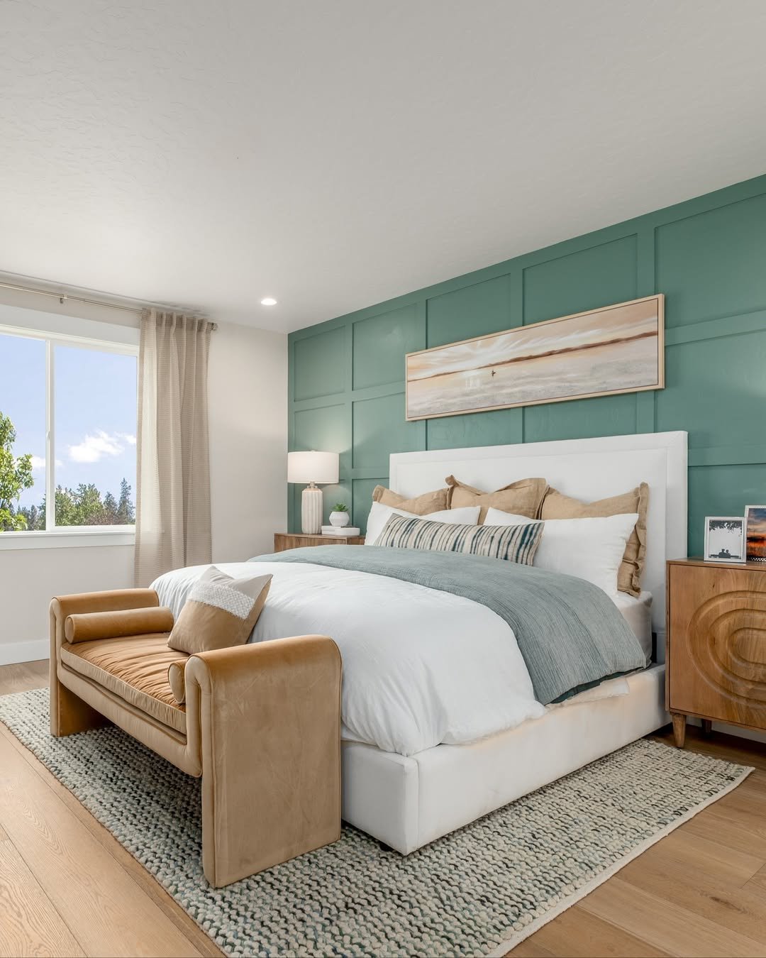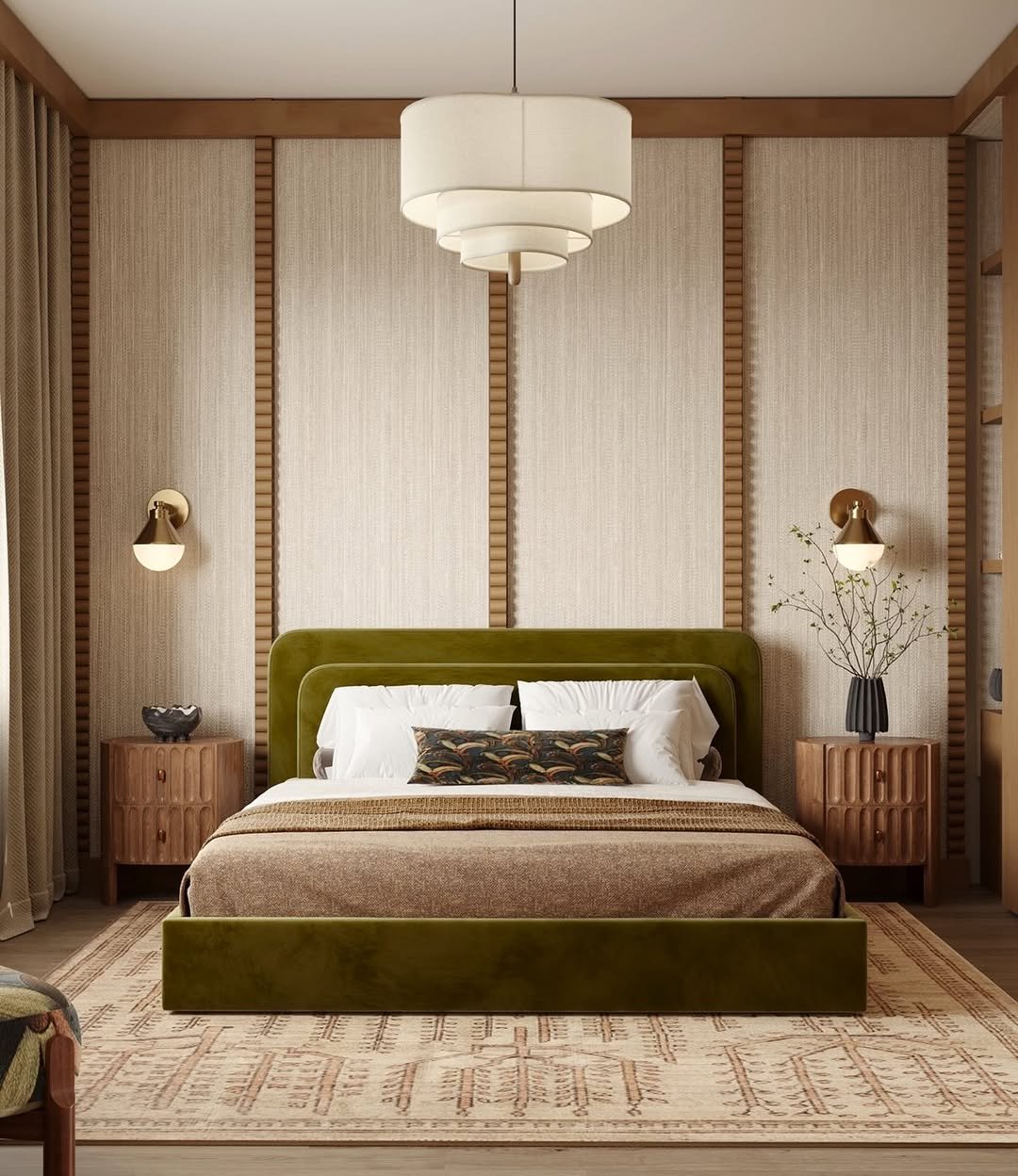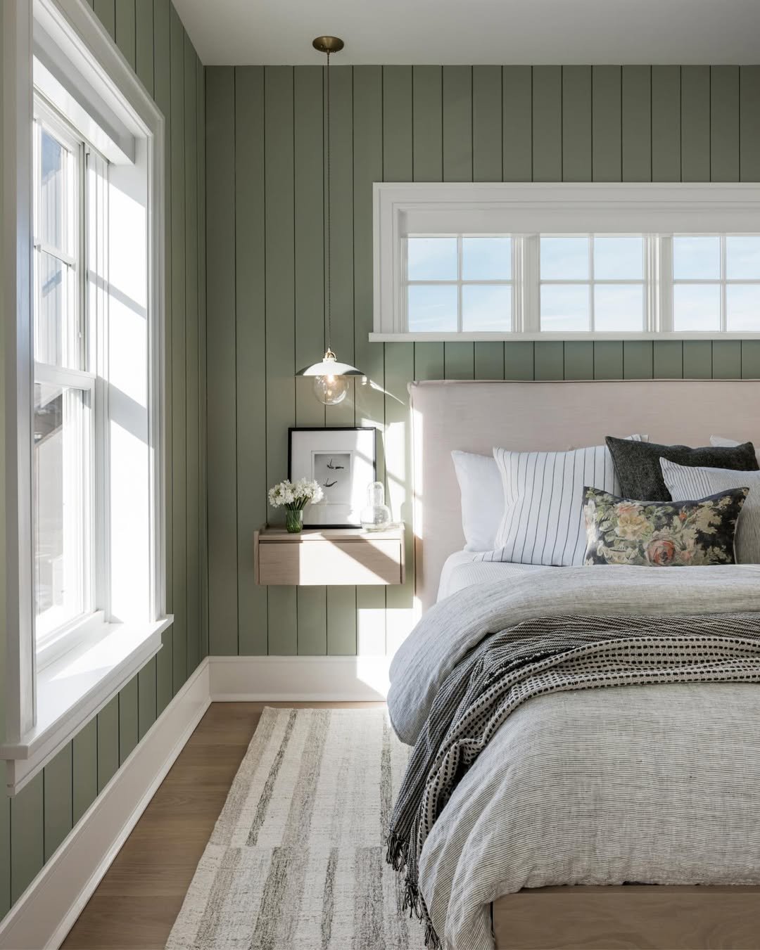 This space feels polished in a very effortless way. The vertical sage paneling adds structure, while the neutral bedding and warm lighting soften everything just enough.