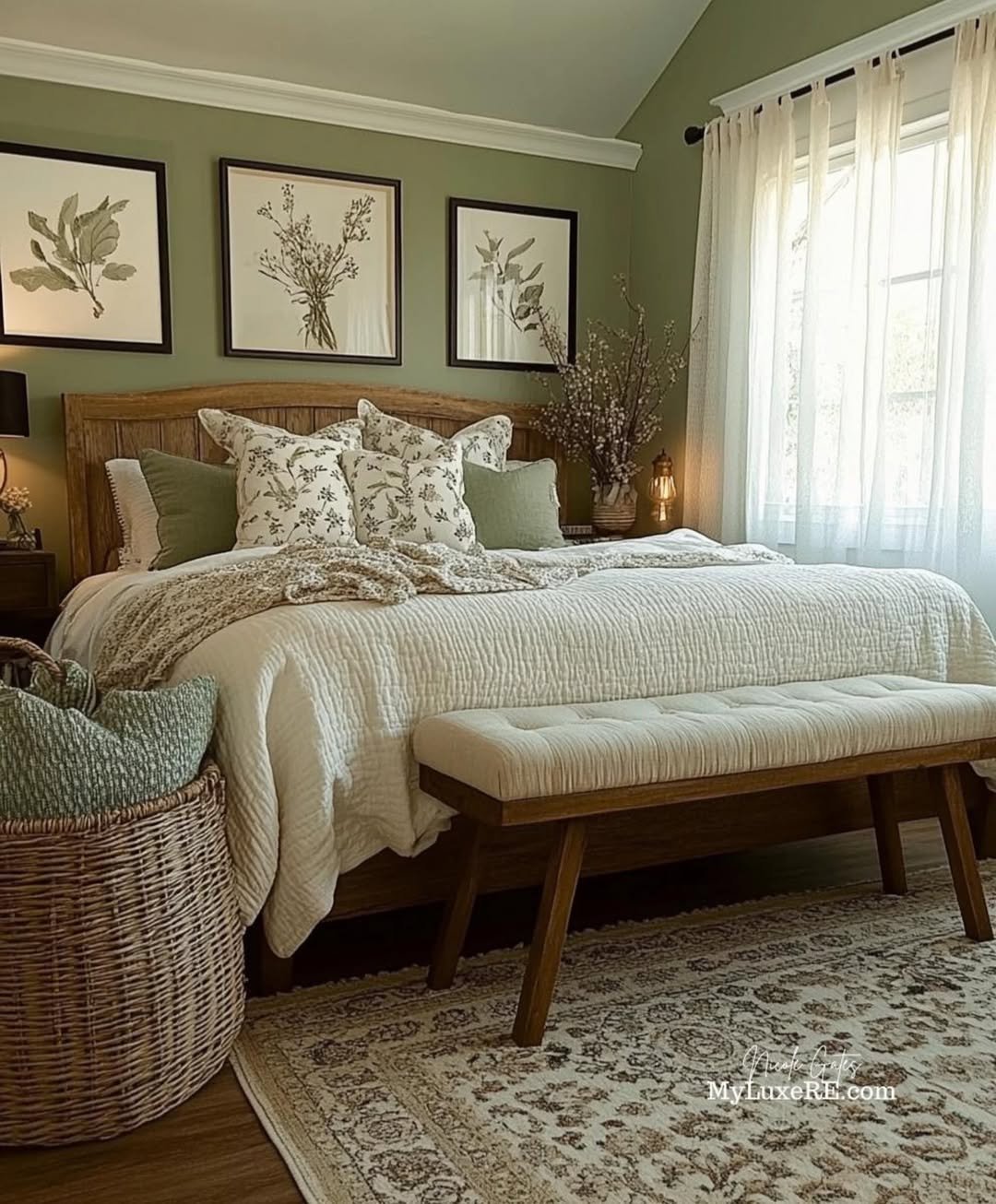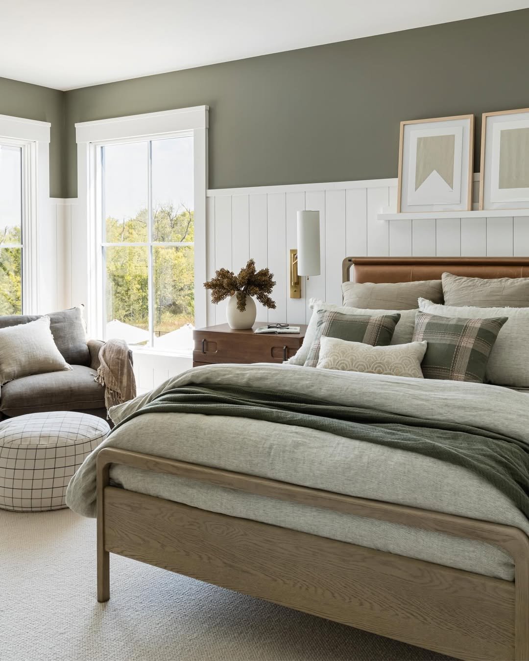 This space blends sage with classic farmhouse elements. White paneling, warm wood, and layered bedding create a look that feels both familiar and elevated.