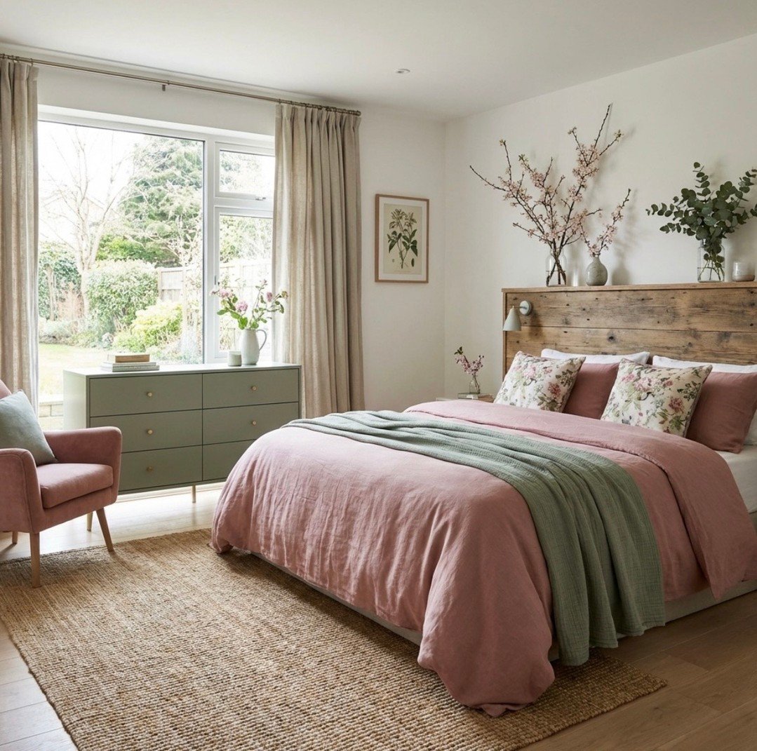 This take keeps things grounded and easy. Sage walls paired with soft neutrals and natural wood create a palette that feels steady and relaxed.