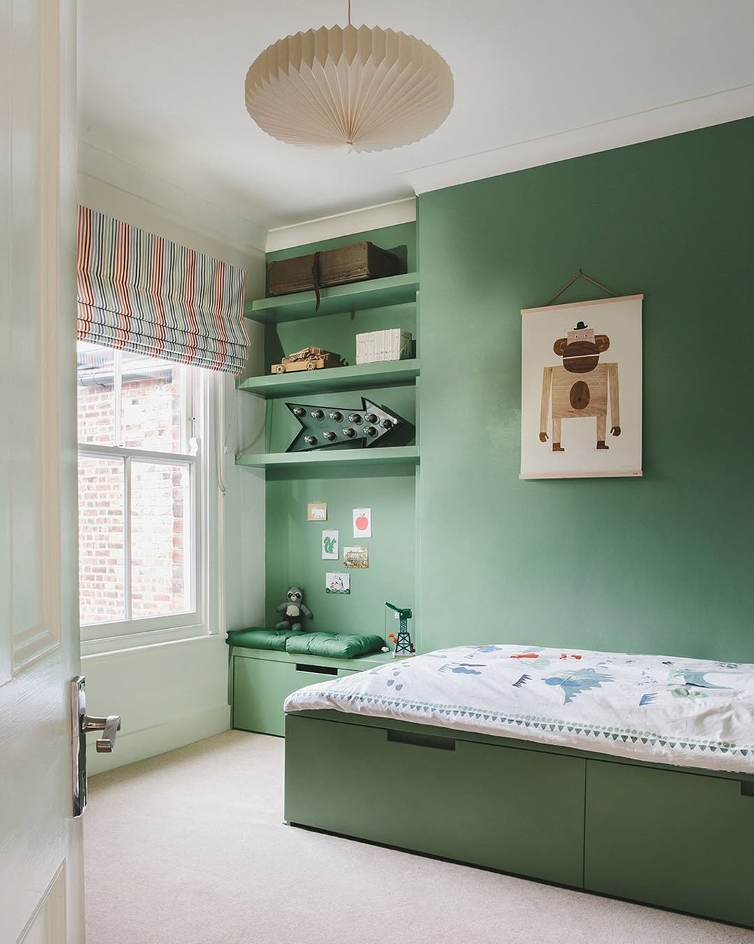 This little corner proves sage works beautifully in playful spaces too. The green walls feel gentle rather than loud, creating a backdrop that lets colorful details and toys shine.