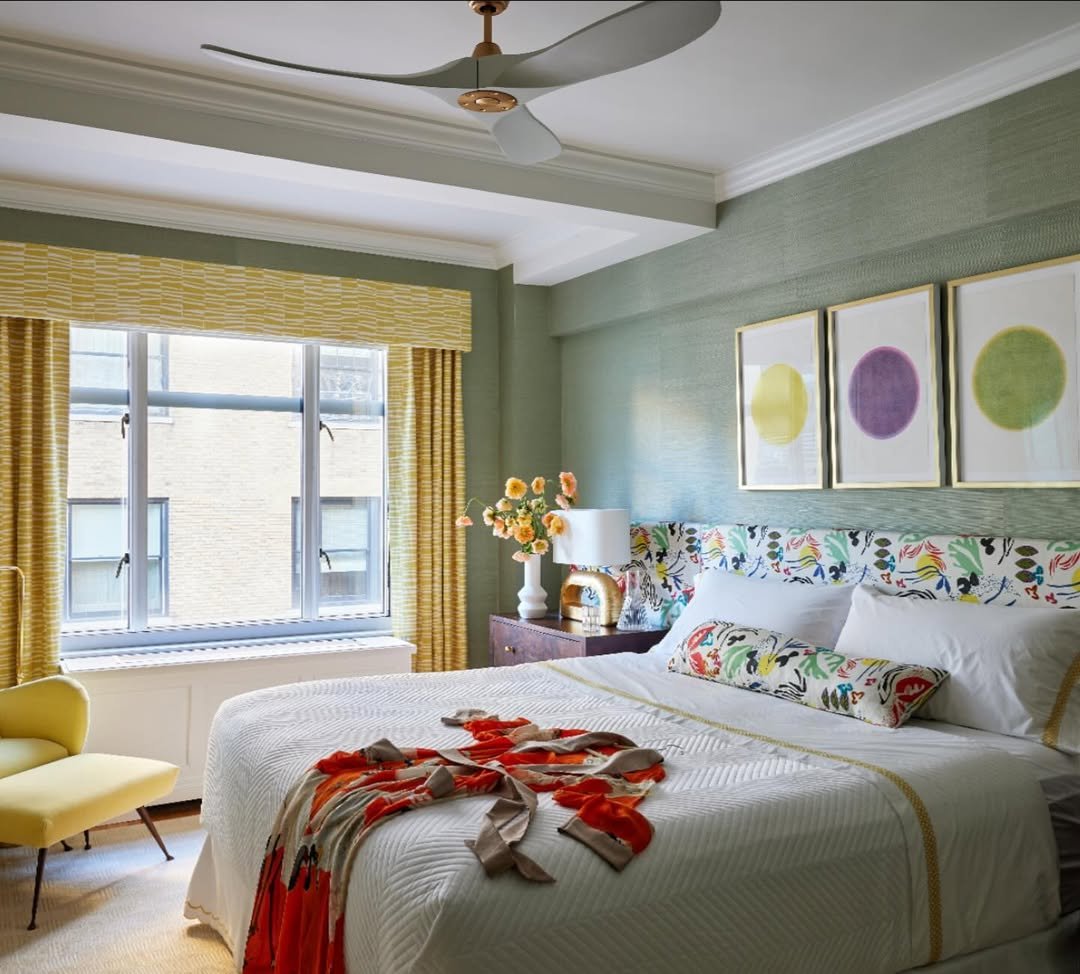 This room has a spark to it. The sage grasscloth walls set a grounded tone, but then those sunny yellow drapes and playful prints step in and completely shift the mood.
