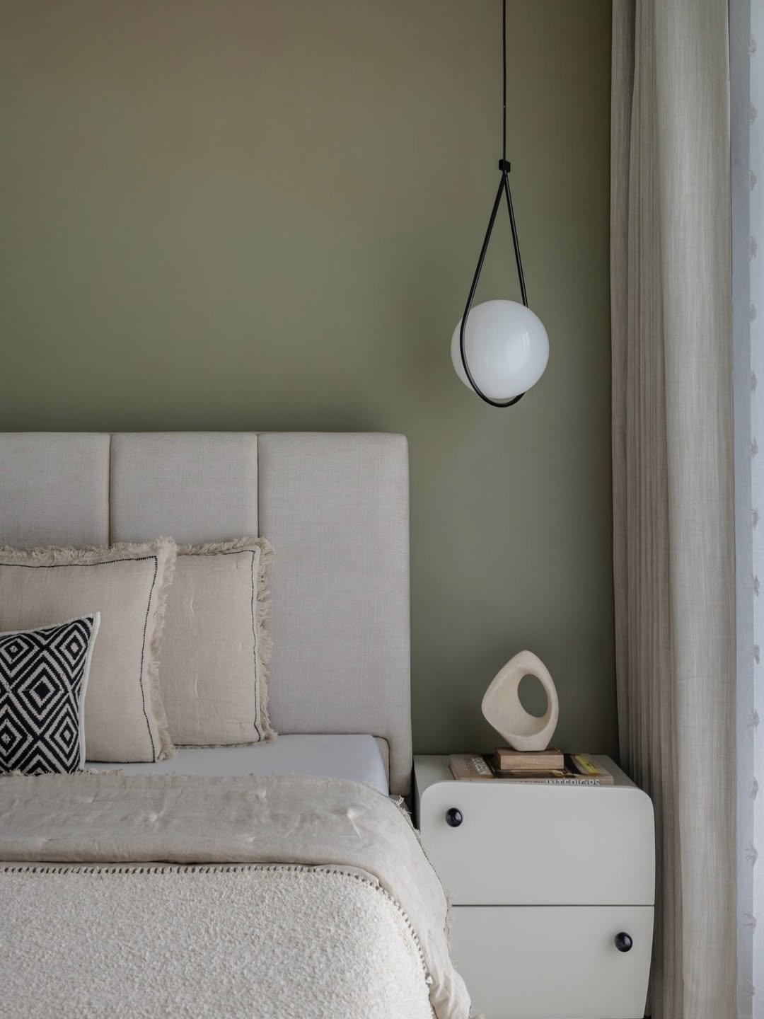 There’s something so calming about this palette. The sage wall sits quietly behind layers of creamy linen and soft textures, letting the space breathe without trying too hard. Even the simple pendant light feels like it’s floating, adding just enough shape without interrupting the calm.