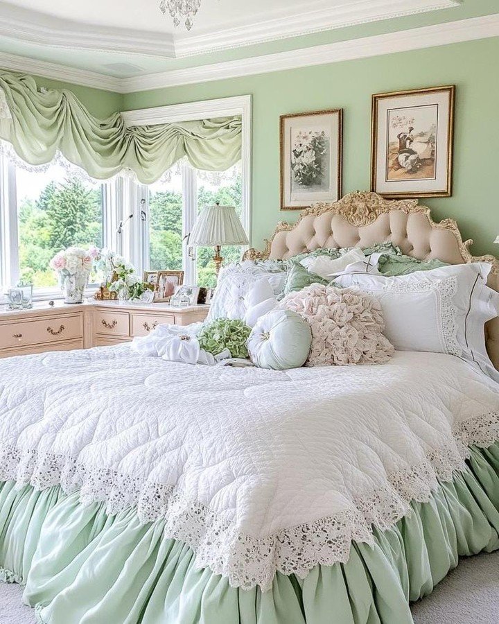 This room feels like stepping into a memory. The pale sage walls meet delicate lace, ruffles, and carved wood details that bring a sense of nostalgia without feeling heavy.
