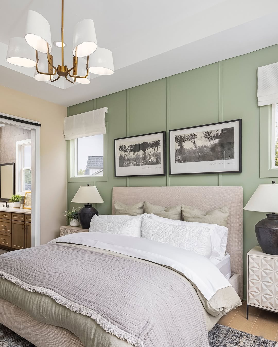 This room keeps things light and airy. The sage wall sits above clean white paneling, creating a subtle contrast that feels fresh but never overwhelming.