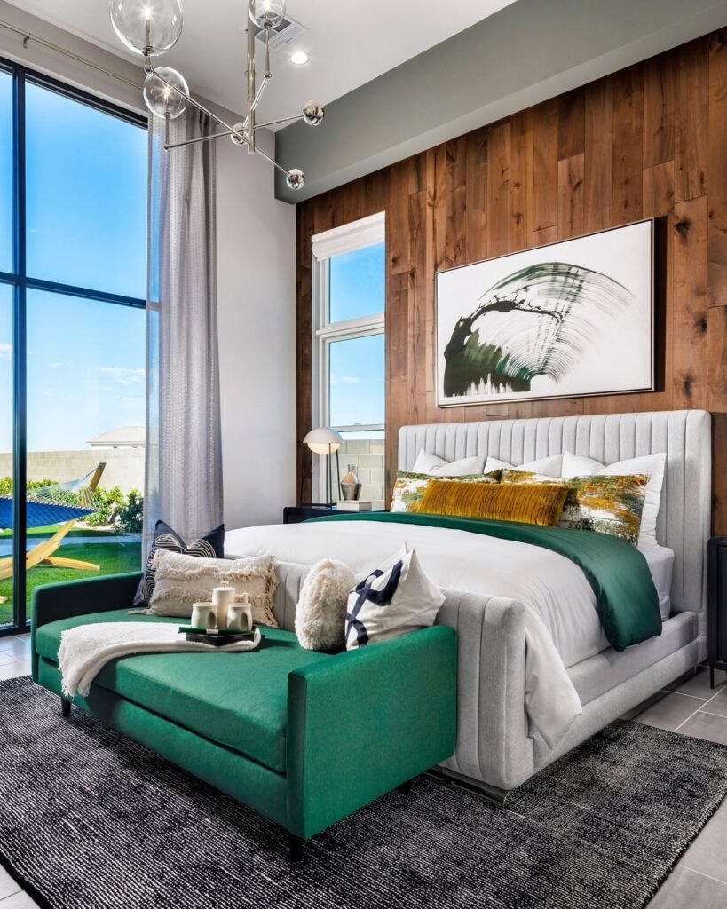 This one leans a bit bolder. The rich wood wall brings depth, while the green accents layered across the bed and bench create a strong, grounded contrast.