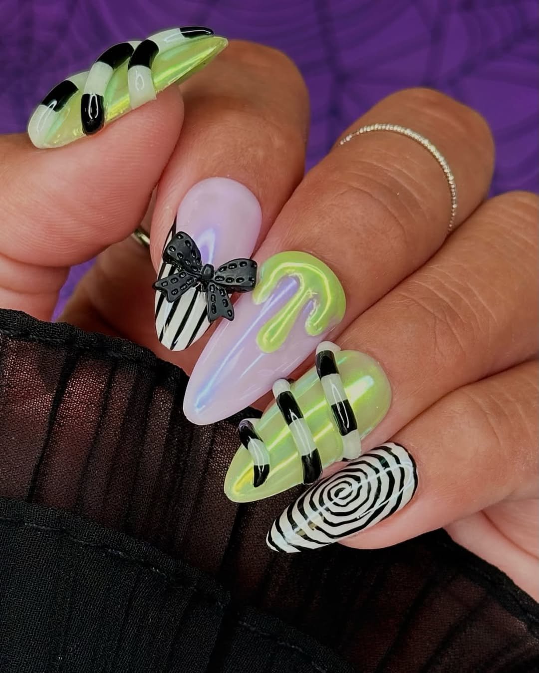 These nails feel electric—like you just walked out of a haunted rave. So good for parties or anyone who likes a little glitter with their ghosts.