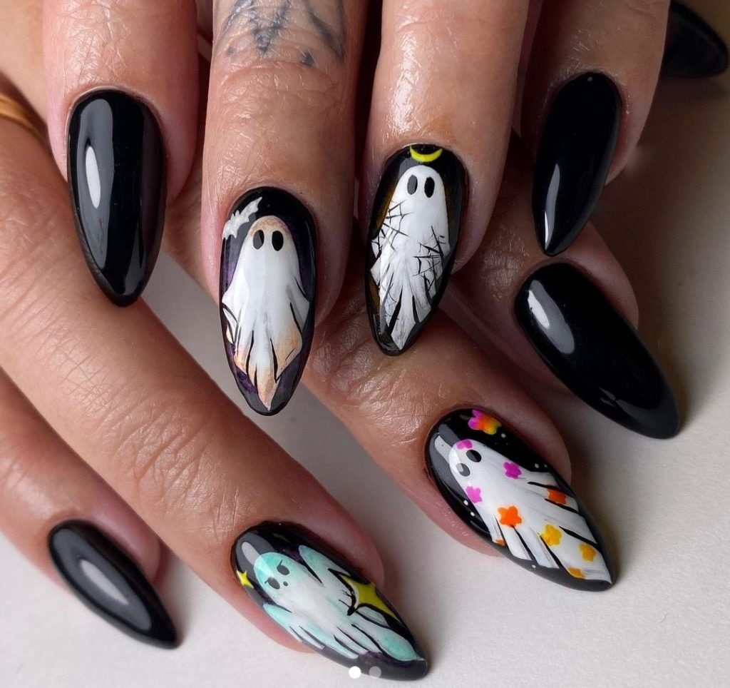 @tiasnailsalon3004 gives us glossy black almond tips with adorable ghosties floating mid-boo. Each little phantom is hand-painted with personality, from celestial halos to candy-colored stars. The effect? Playful, a little eerie, and endlessly wearable.