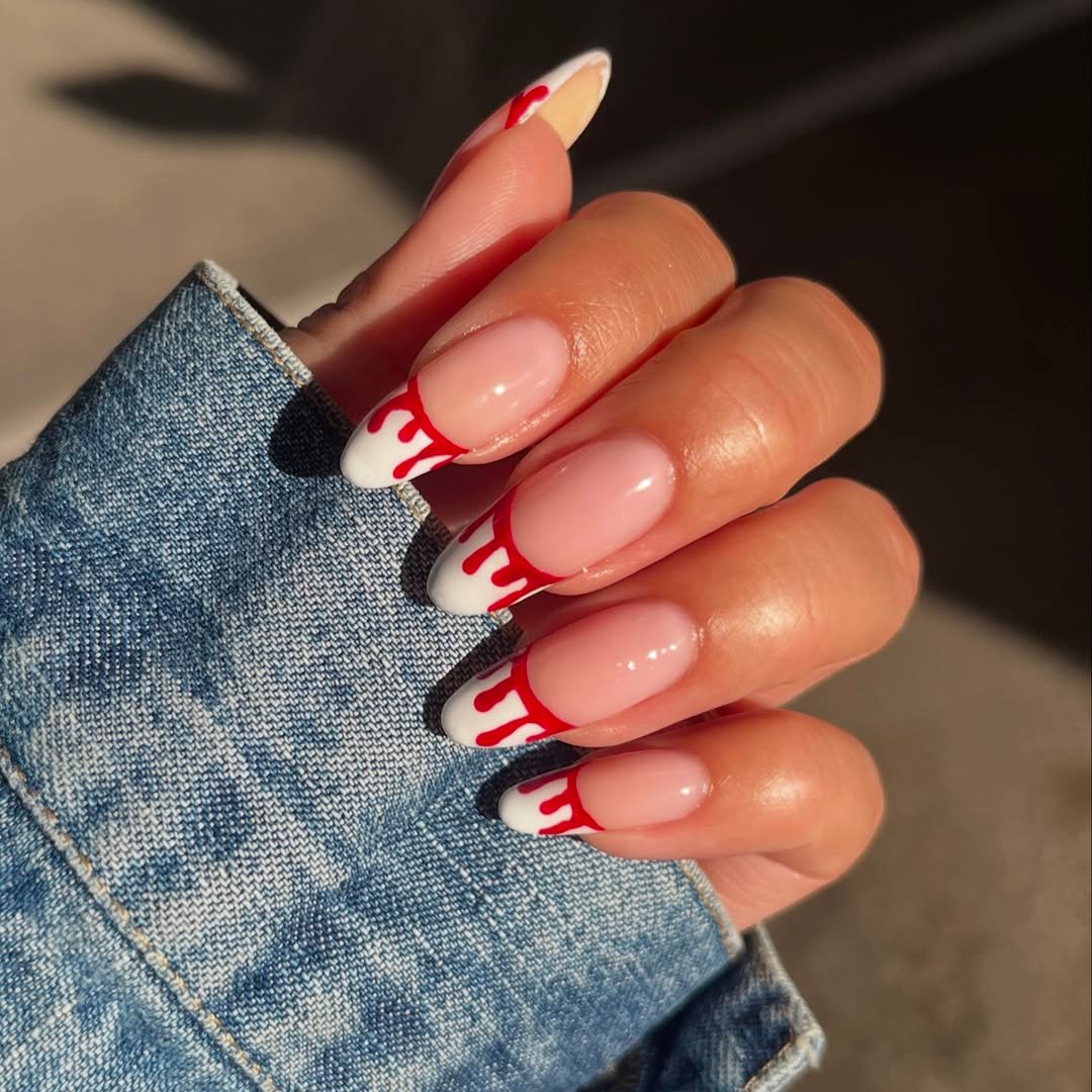 French tips, but make them scream. These milky nails from @cre8withcass are sweet at first glance, but the sharp red drips are giving femme fatale realness. They remind me of strawberry syrup over vanilla ice cream—if that ice cream were plotting revenge.