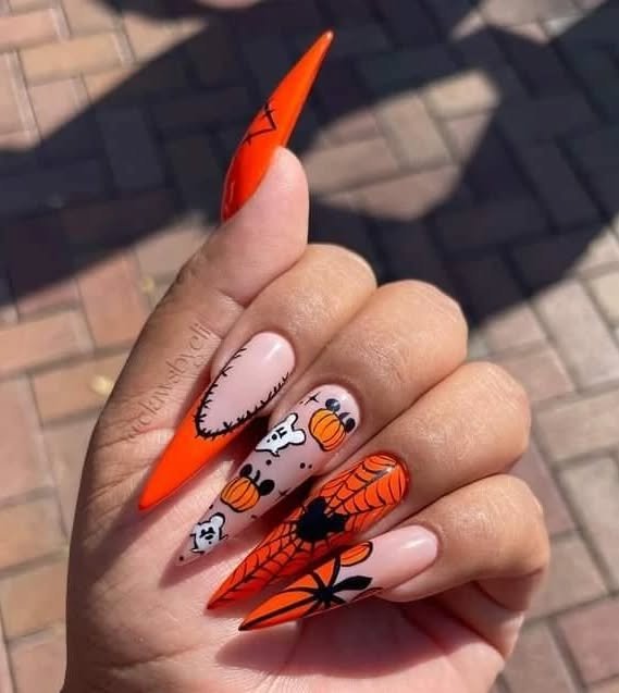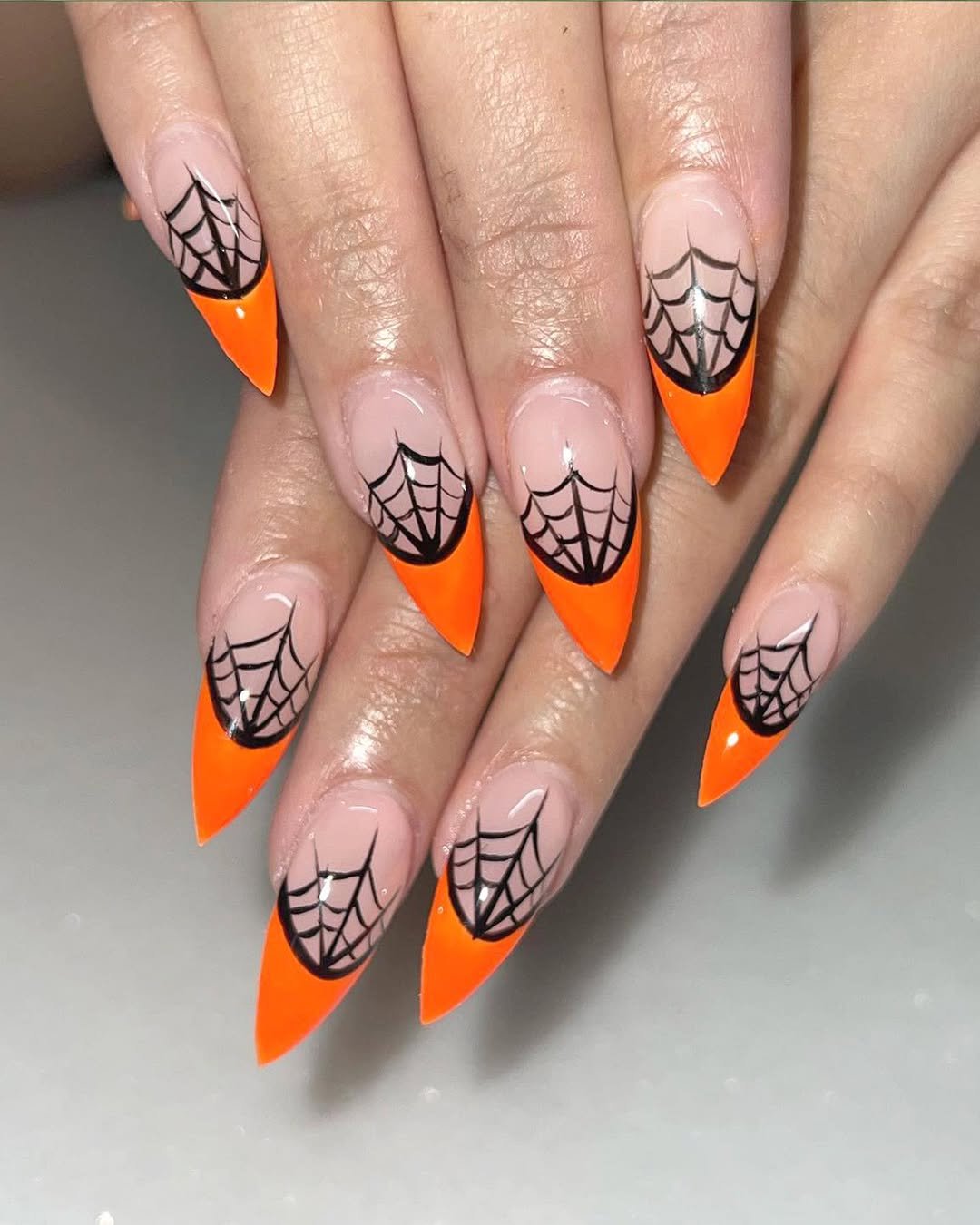 There’s nothing quite like the punch of neon orange to scream Halloween. These pointed webs by @daily_charme feel retro and timeless at once—like cartoon witch meets runway glam. The sharp stiletto tips give drama, while the glossy black webs keep things clean and graphic.